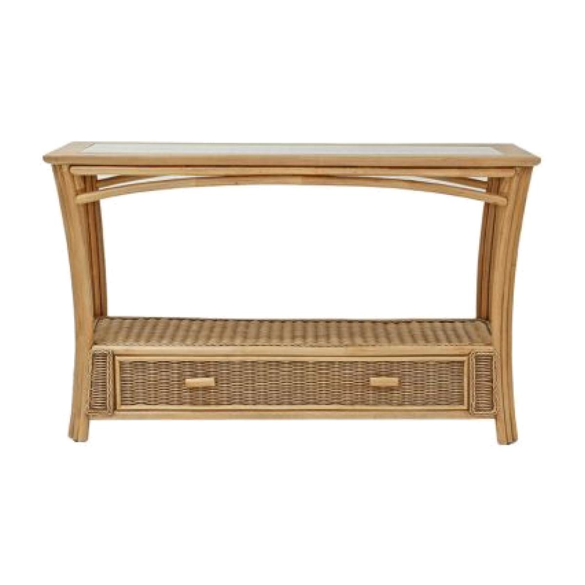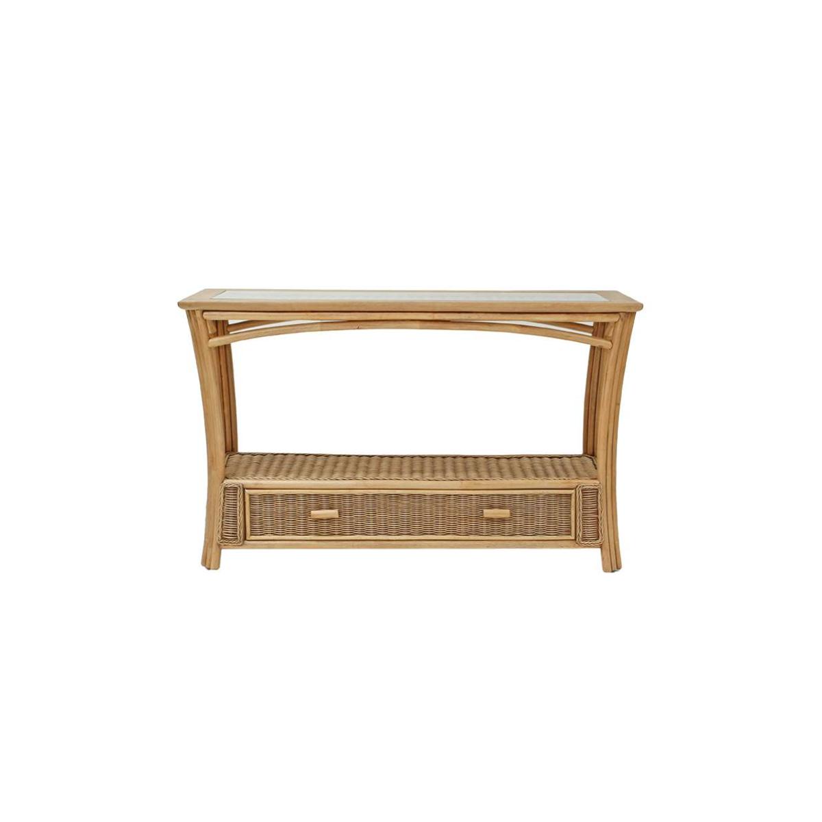 This beautiful hand crafted natural oak wash rattan console table has been designed with style and practicality in mind. Featuring natural cane legs and panelled with a beautiful rattan weave design, this console table complements the Dundee range of furniture perfectly. Finished with a glass top and an additional shelf and drawer for extra storage. This beautiful piece of furniture complements most interior decor styles. Ideal for the conservatory, lounge/diner, sun room, garden room, orangery or hallway.   Exclusive hand crafted design Dimensions: 74cm (H) x 46cm (D) x 122cm (W) 2 Year Manufacturer's Guarantee  All screens vary in colour reproduction and whilst every effort has been made to display the colour as accurately as possible it is for guidance only.