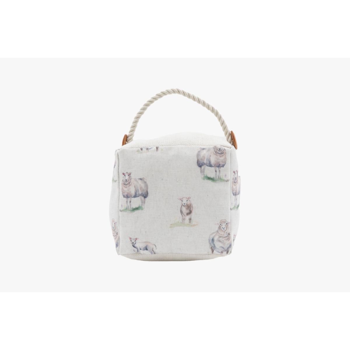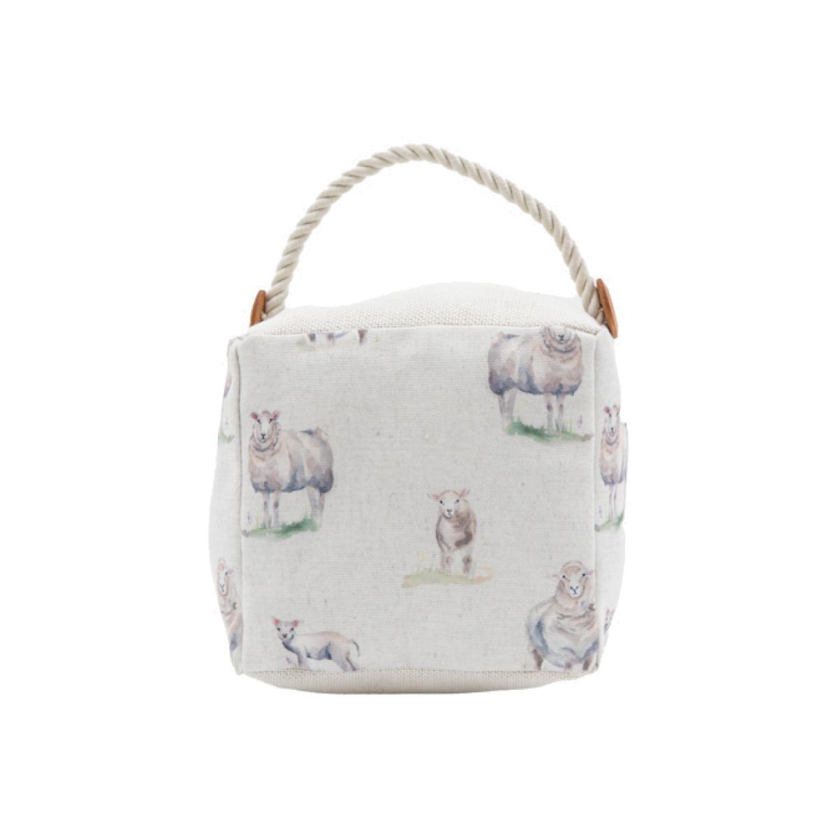 Stop that door! Keep everything in place and in style with this handy little doorstop. Perfectly weighted to hold your doors in place this little fabric cube is covered in happy highland sheep, finished with a rustic rope handle and wooden button details this is just bursting with charm and style.