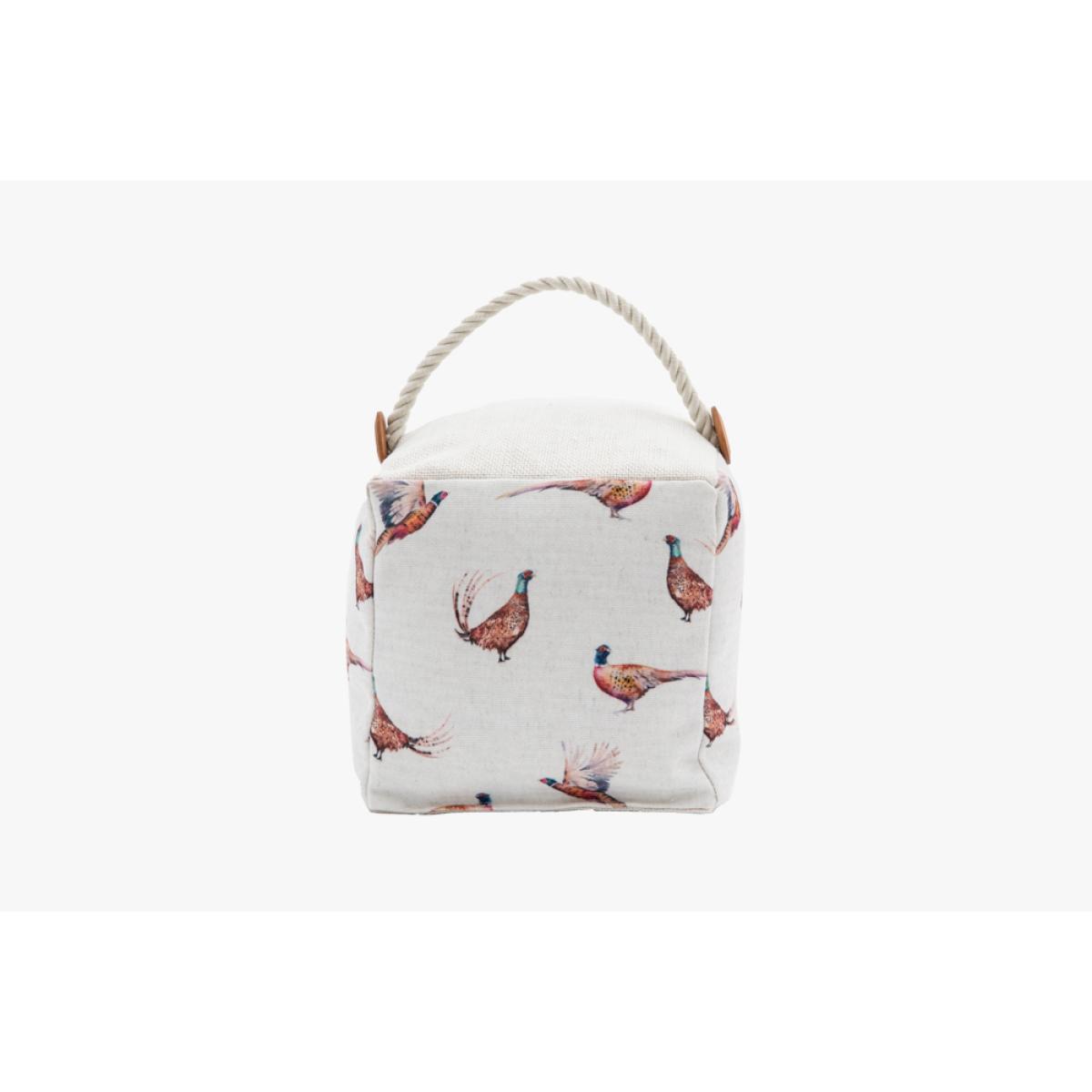 Stop that door! Keep everything in place and in style with this handy little doorstop. Perfectly weighted to hold your doors in place this little fabric cube is covered in highland pheasants, finished with a rustic rope handle and wooden button details this is just bursting with charm and style.