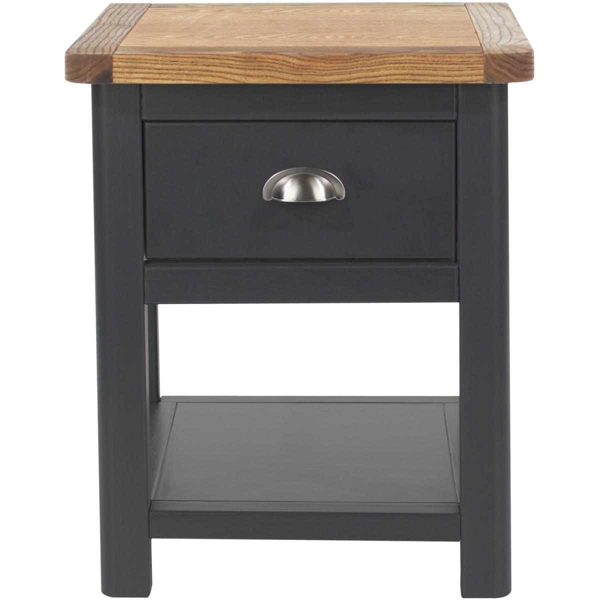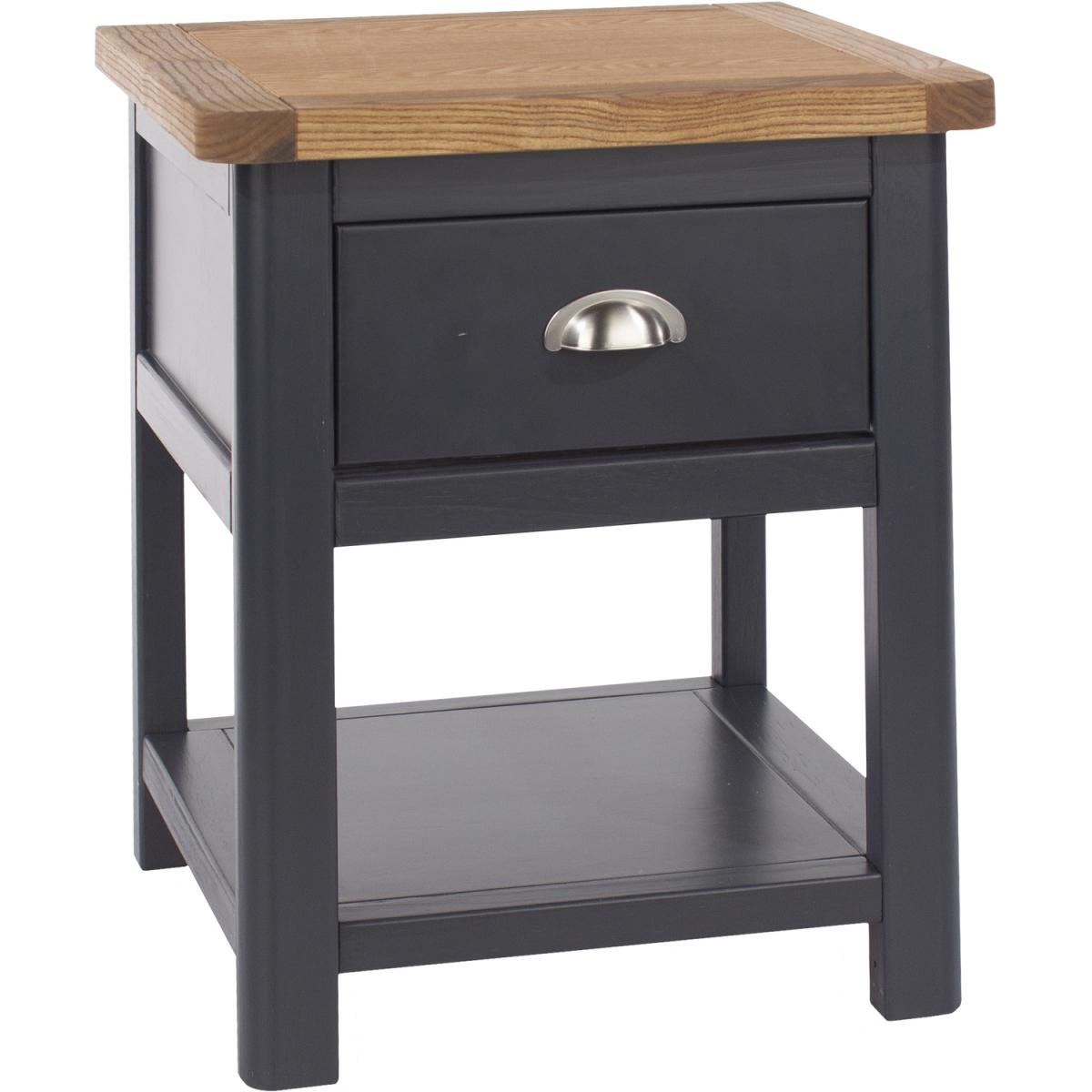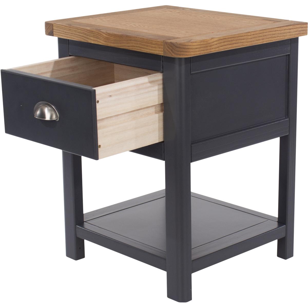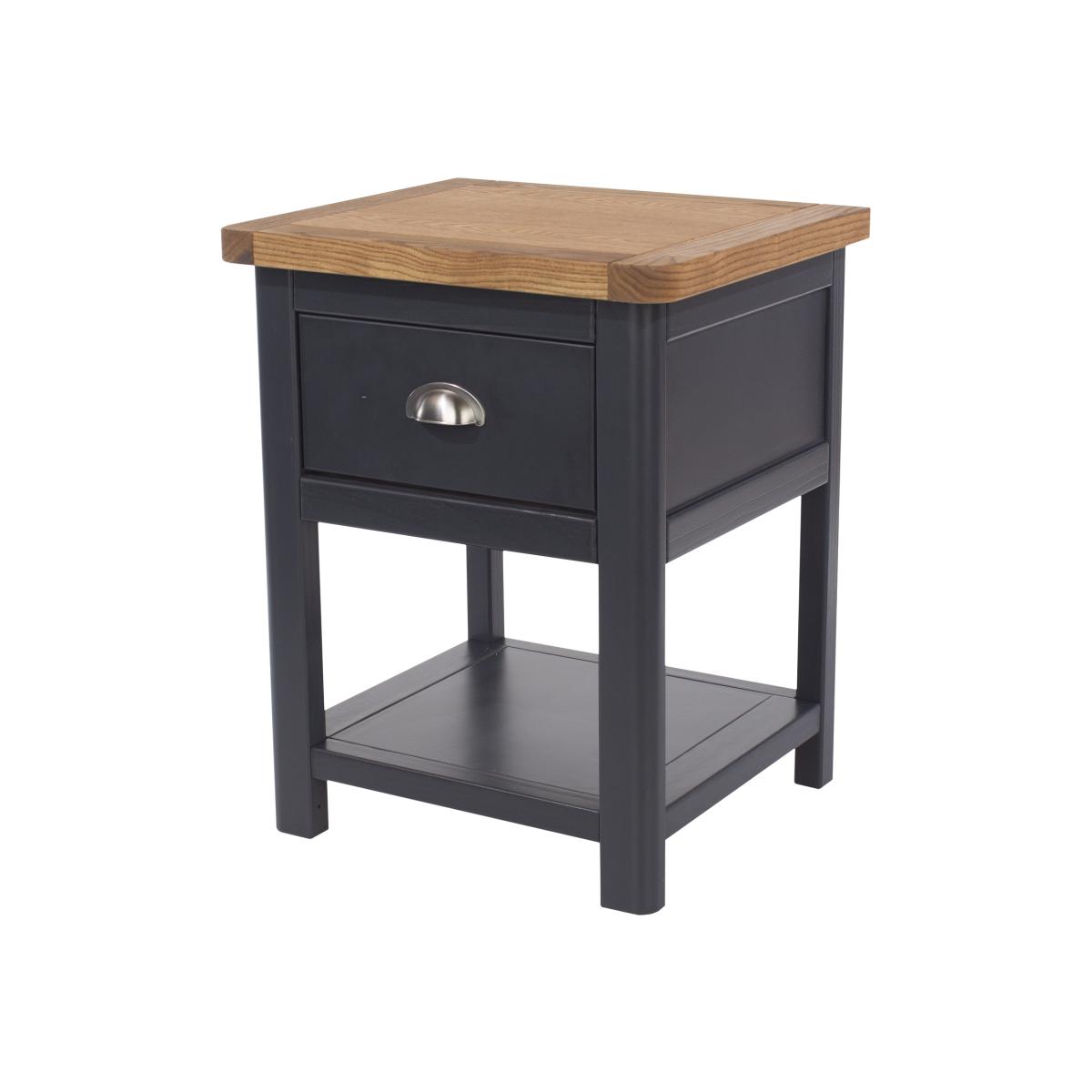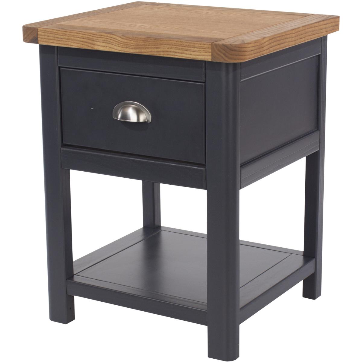 The Dunkeld range is made using traditional materials and cabinet construction methods. Delivered to you flat packed for easy home assembly. Finished in a luxurious midnight blue paint with an antique waxed hardwood top. Drawer boxes are made from hardwood with drawer stops for your safety and are finished with matt silver effect cup handles. This 1 drawer bedside cabinet offers you the perfect combination of a drawer for storage and a shelf below to house your slippers or reading material. The top has space for a lamp, your phone or a morning cup of tea.