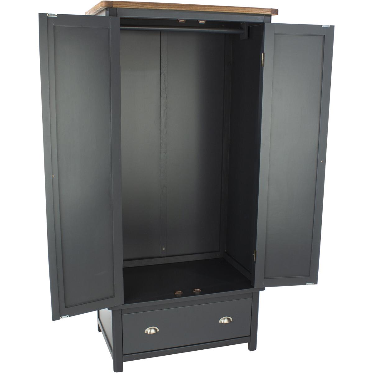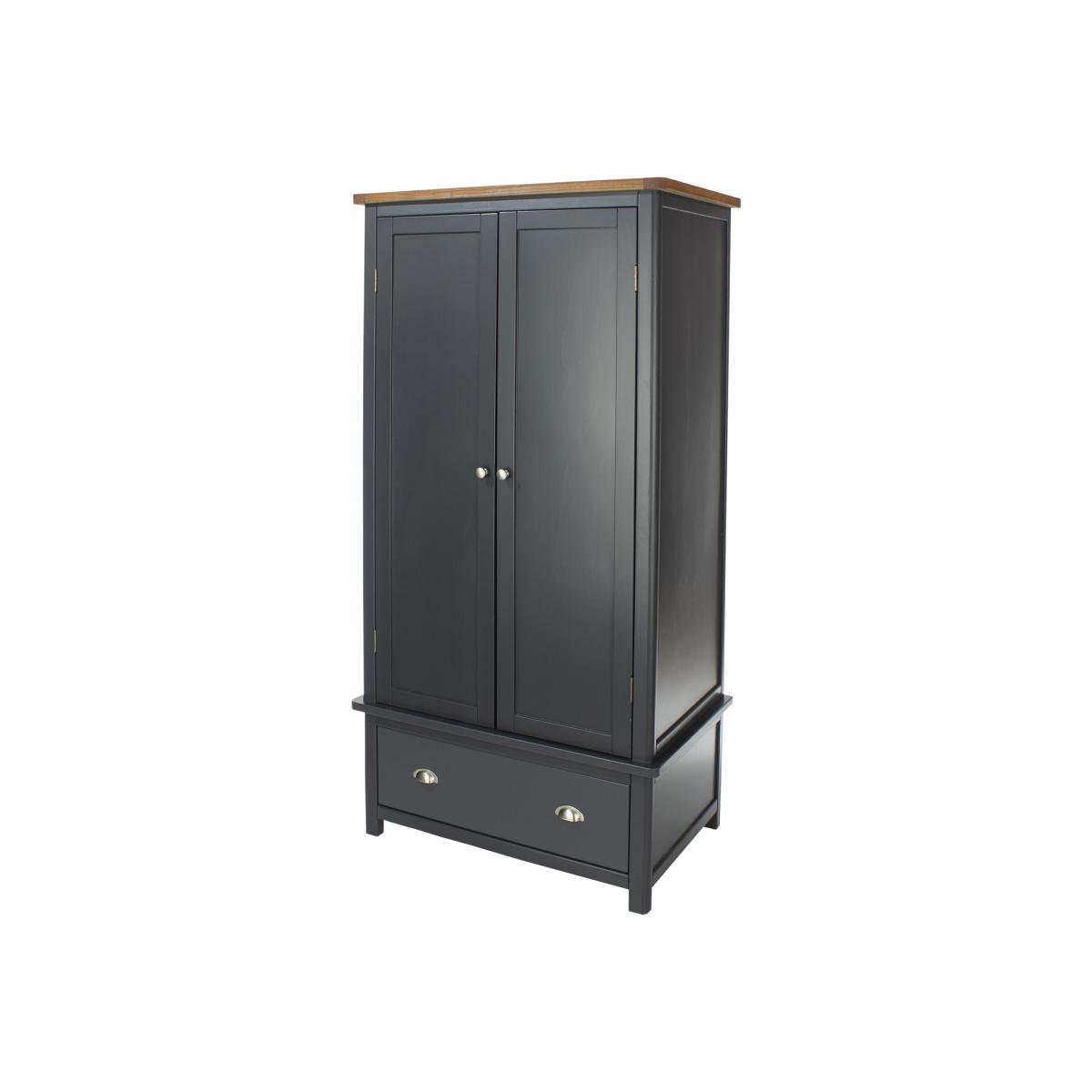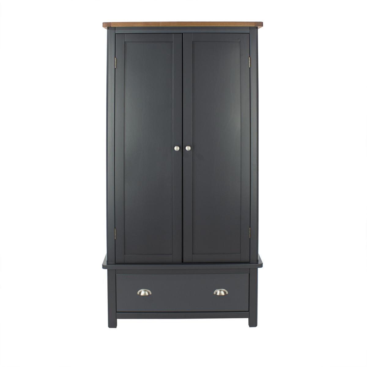 The Dunkeld range is made using traditional materials and cabinet construction methods. Delivered to you flat packed for easy home assembly. Finished in a luxurious midnight blue paint with an antique waxed hardwood top. Drawer boxes are made from hardwood with drawer stops for your safety and are finished with matt silver effect cup handles and knobs. This 2 door 1 drawer wardrobe offers a combination of hanging storage space with a rail and a drawer underneath for extra clothes storage or for hiding away a spare duvet or blankets.