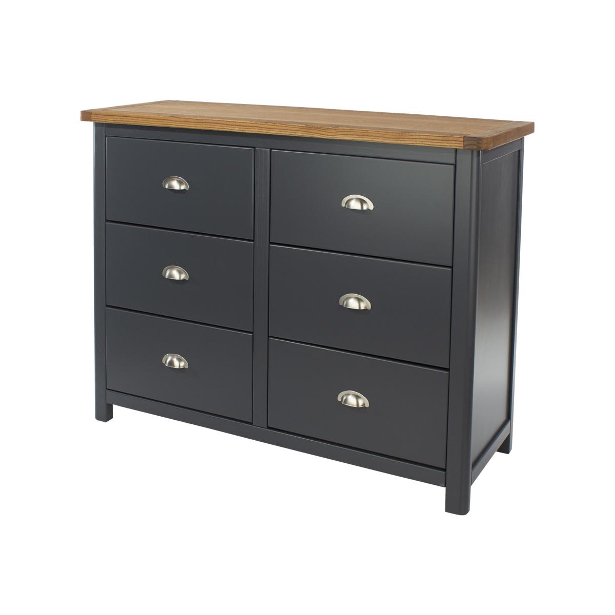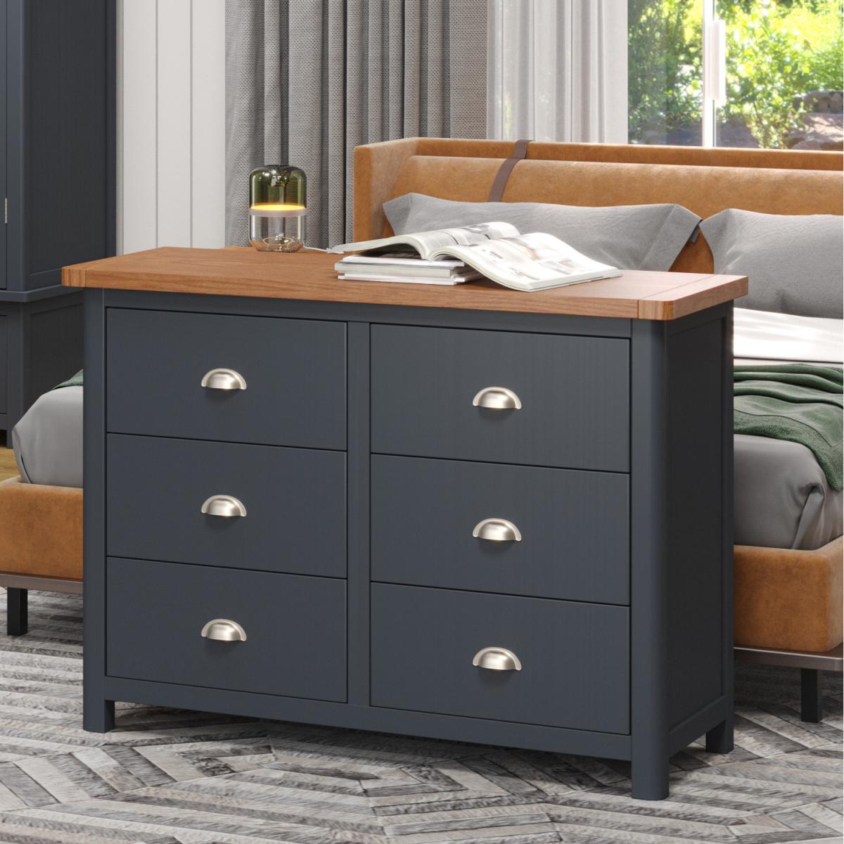 The Dunkeld range is made using traditional materials and cabinet construction methods. Delivered to you flat packed for easy home assembly. Finished in a luxurious midnight blue paint with an antique waxed hardwood top. Drawer boxes are made from hardwood with drawer stops for your safety and are finished with matt silver effect cup handles. This 6 drawer wide chest, 3 drawers alongside 3 drawers, allows you to store your clothing in an organised way. There is space for underwear, tshirts and jumpers, gym kit or anything else you need to find a home for. The top offers space for a lamp, your favourite reading material or precious photos to be displayed.