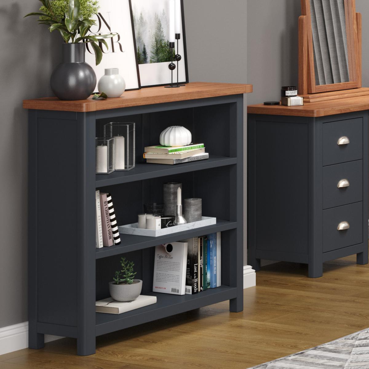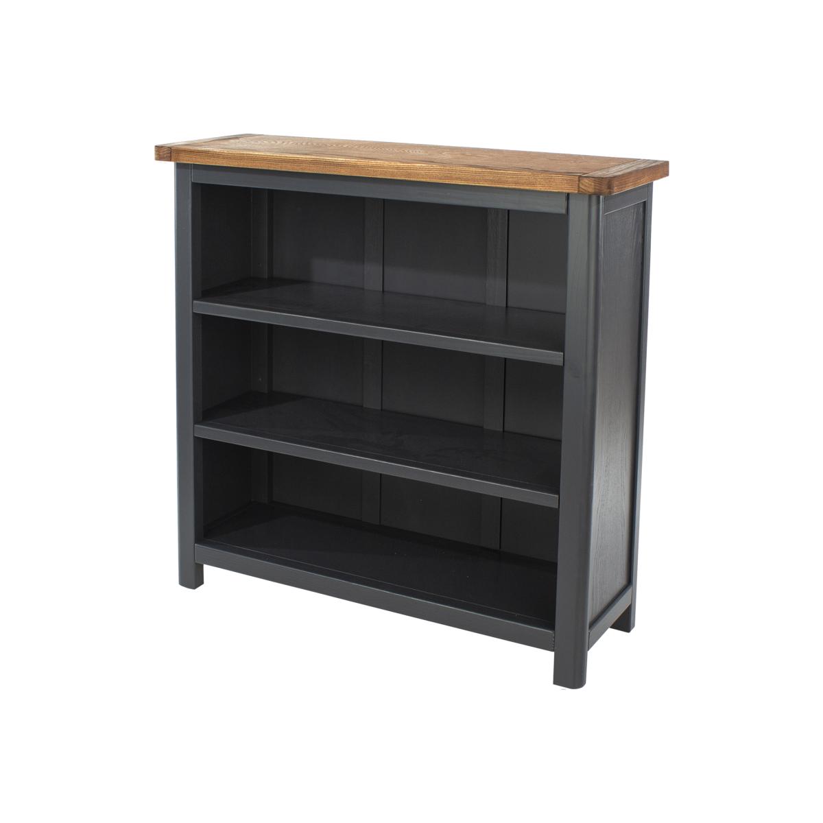 The Dunkeld range is made using traditional materials and cabinet construction methods. Delivered to you flat packed for easy home assembly. Finished in a luxurious midnight blue paint with an antique waxed hardwood top. The shelves are adjustable to predrilled points to suit your requirements. This low bookcase is ideal for storing all your reading material together whether it be books or magazines, or you can display your favourite photos or treasures.