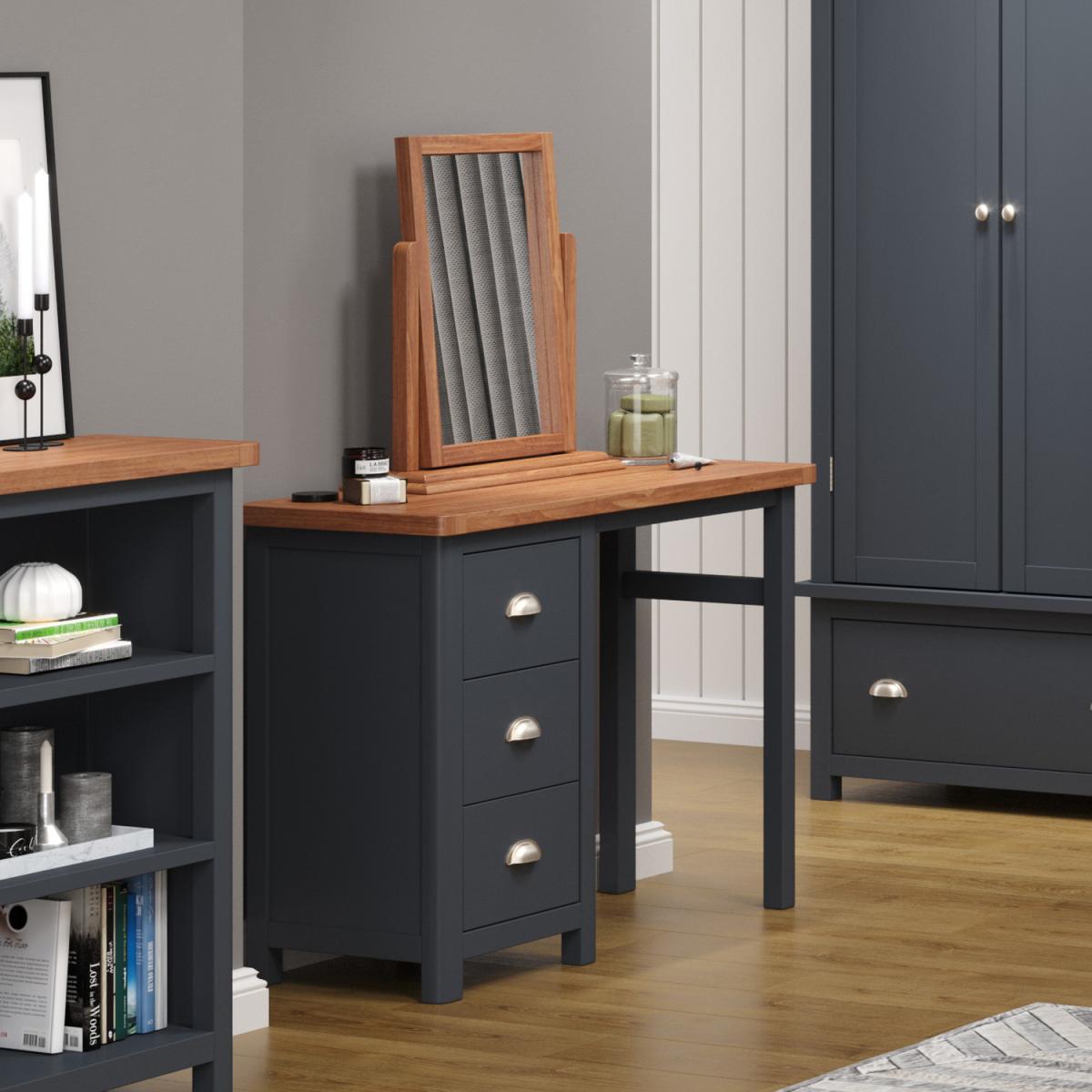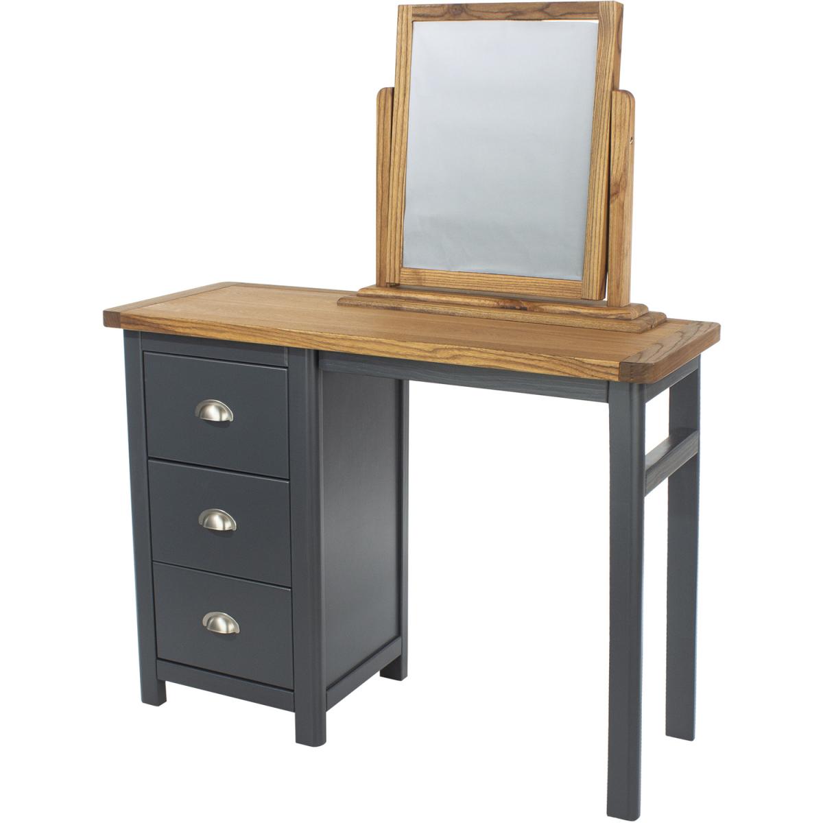 The Dunkeld range is a fresh modern take on classic colonial furniture design. The range is hand crafted in mdf in a striking midnight blue paint colour and finished with contrasting softwood tops in a warm antique oak coloured stain. This dressing table mirror compliments the range perfectly and is suitable for using on the dressing table or one of the chest of drawers to complete your look. The angle of the mirror can be adjusted to suit your requirements and the mirror is safety backed for peace of mind in the event of any breakages.