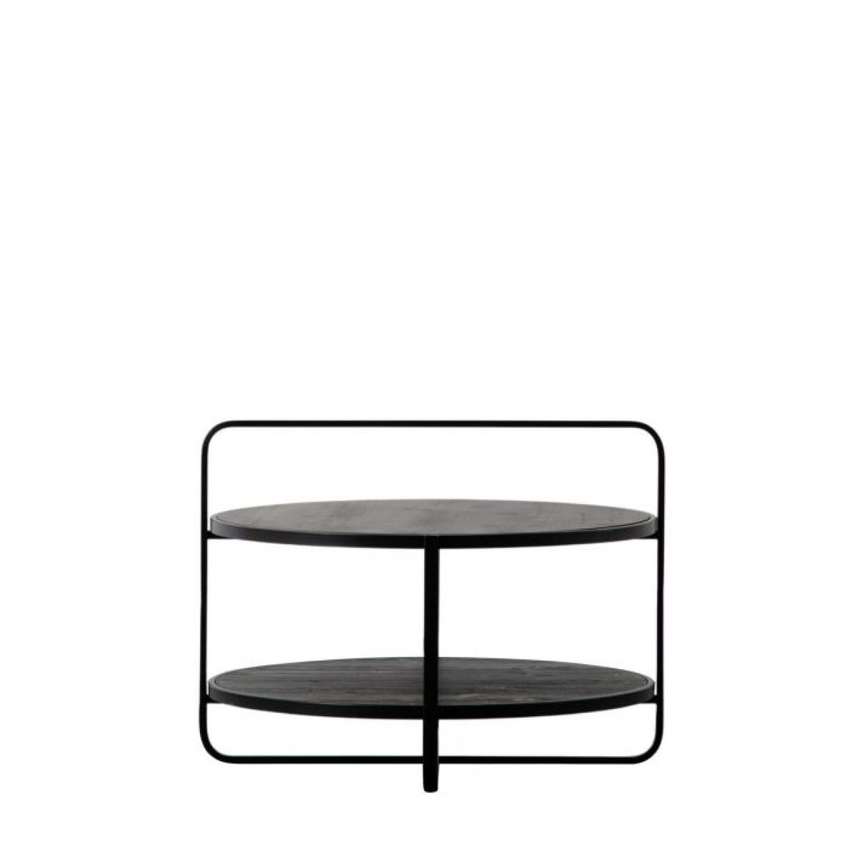 Contemporary coffee table crafted from metal with an antique pewter finish, combined with a natural fir veneer top and shelf in a stunning black finish. The unusual design features a continuation of one section of the base, up and over the table to create a 'handle' effect.