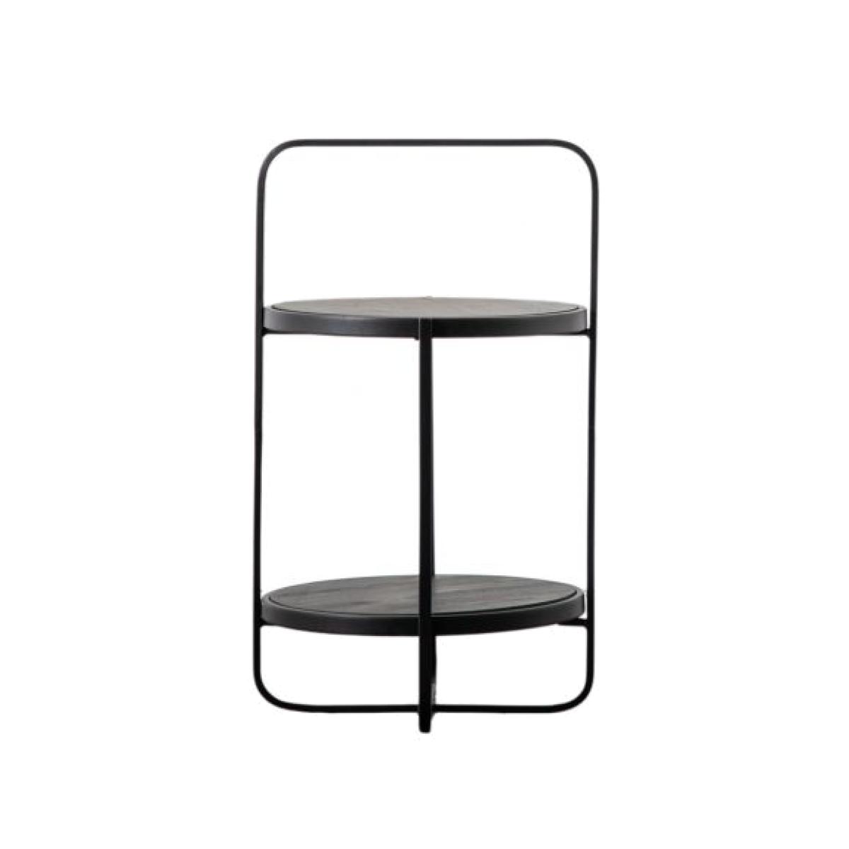 Contemporary side table crafted from metal with an antique pewter finish combined with a fir veneer top and shelf in a stunning black finish. The unusual design features a continuation of one section of the base, up and over the tables to create a 'handle' effect.