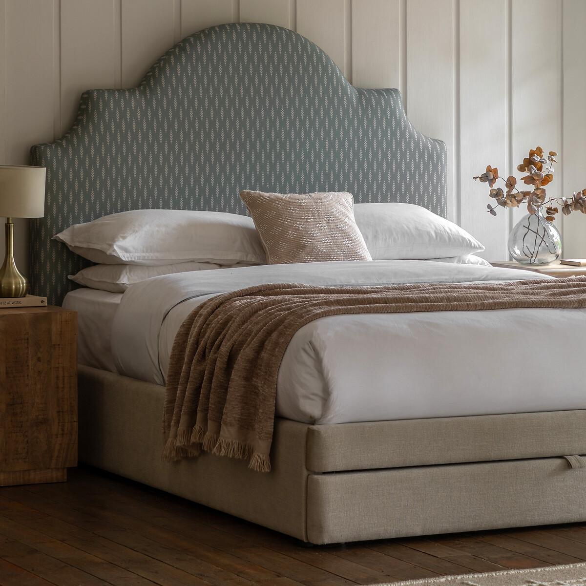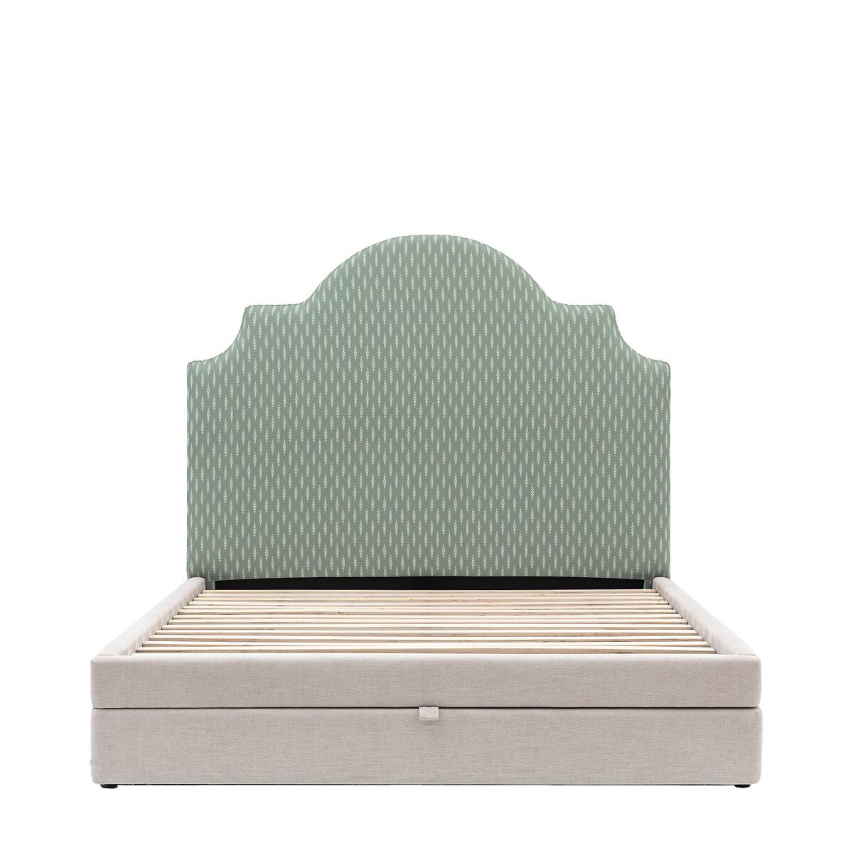 With a tall French-style shaped headboard, the Dunsford is perfect for adding a touch of "je ne sais quoi" to the boudoir. Delicate green leaf patterned upholstery creates a stunning backdrop for a serene sanctuary. To keep your space feeling luxurious, a pull out drawer at the end of the bed helps keep your space feeling elegant and clutter free. Product details • Upholstered storage bed with end drawer • French-style ornate headboard • Subtle fern leaf print design fabric • Solid slatted base • Extra tall headboard design • Central drawer with tab opening and two wood-lined compartments • Full assembly required • 12 month manufacturers warranty. Product Composition - MDF 35% / Mixed Fabric (Polyester / Nylon) 35% / Foam 20% / Slat (LVL) 10%Product Dimensions Double 206 cm x 149 cm x 150 cm, Weight - 69.4 kg. Dimensions of Internal Drawer Compartments (x2) - W63.7 cm x D45.6 cm x H14.7 cm Footboard Height - 33.5 cm Clearance to floor - 2.5 cm. King 216 cm x 164 cm x 150 cm, Weight - 75 kg. Dimensions of Internal Drawer Compartments (x2) - W71.2 cm x D45.6 cm x H14.7 cm Footboard Height - 33.5 cm Clearance to floor - 2.5 cm. Packaged Dimensions. Double: Parcel 1 Packaged Dimensions - 154 cm x 151 cm x 13 cm, Weight 26 kg Parcel 2 Packaged Dimensions - 198 cm x 34 cm x 25 cm, Weight 31.9 kg Parcel 3 Packaged Dimensions - 141 cm x 51 cm x 22 cm, Weight 20 kg. King:Parcel 1 Packaged Dimensions - 169 cm x 151 cm x 13 cm, Weight 28 kg Parcel 2 Packaged Dimensions - 208 cm x 34 cm x 25 cm, Weight 34 kg Parcel 3 Packaged Dimensions - 156 cm x 51 cm x 22 cm, Weight 22.5 kg. This product will be dispatched by one of our trusted suppliers. You’ll be contacted by their selected courier about your delivery. Please note: this product cannot be delivered to all Offshore Islands, Northern Ireland or Republic of Ireland.