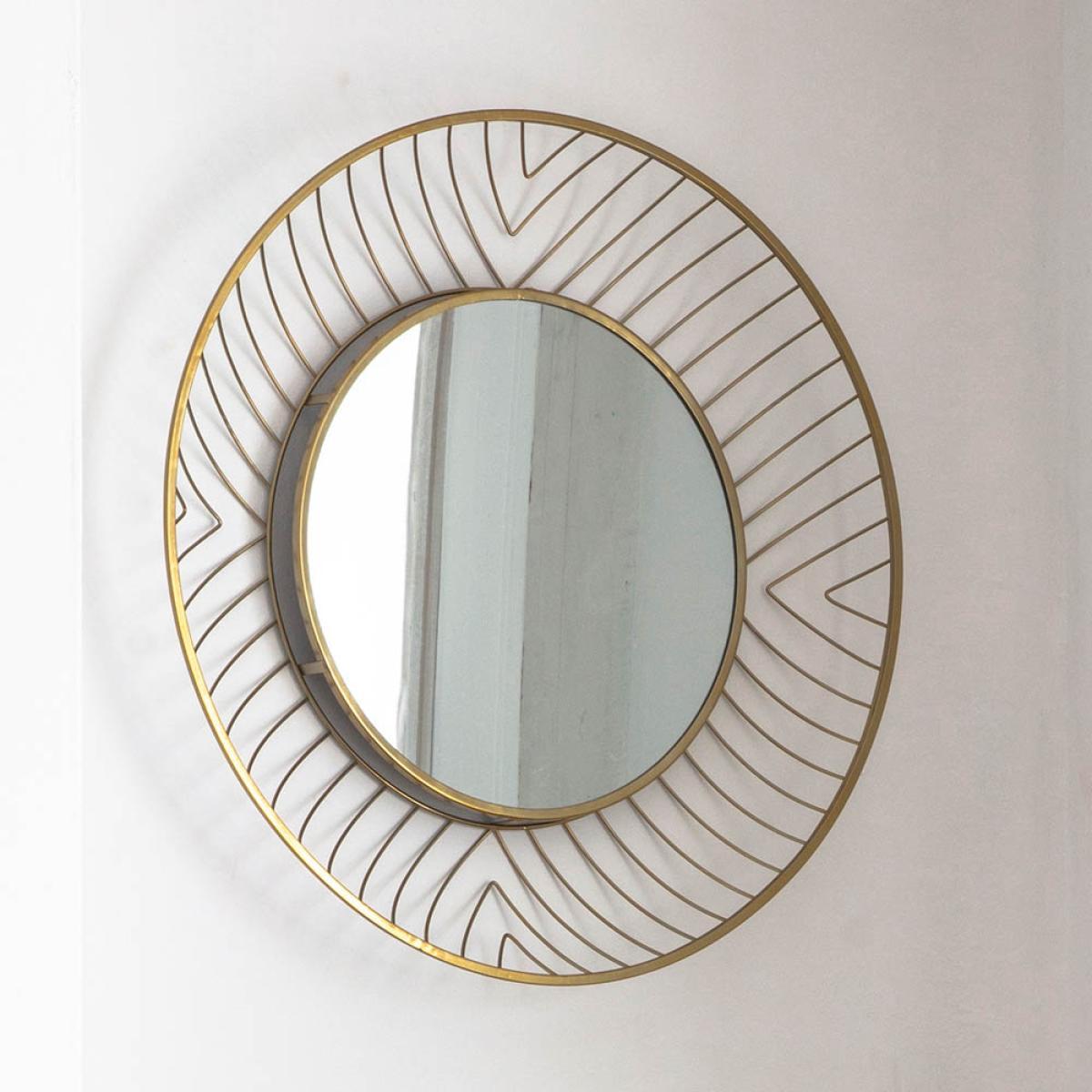 I love this round gold mirror because it adds a contemporary touch with its sleek, open frame design, making it versatile for various interior styles. It works well in minimalist or modern spaces, especially when paired with other metallic accents or neutral tones. For styling tips, consider placing it above a console table or mantel to create a focal point, or use it in a hallway to give the illusion of more space. Its medium size makes it adaptable for small to medium rooms, where it can serve as both functional and decorative artwork. Keeping the surrounding decor simple will allow the mirror’s elegant gold finish to stand out beautifully.