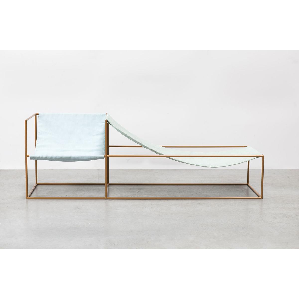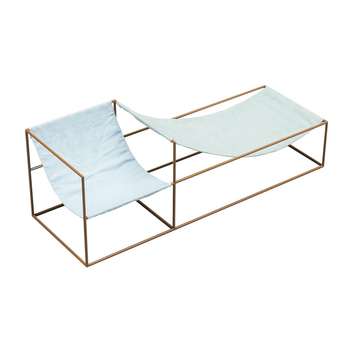 Relax as a couple with this incredible double seat designed by Flemish creative duo Muller Van Severen. Fien Muller and Hannes Van Severen work at the intersection between art and design. They are among the most prominent creators of the moment. From galleries to museums, not to mention collectors, design enthusiasts and design houses, everyone loves their minimalist, colourful furniture, timeless and joyful. In less than a decade, Muller Van Severen has become a key player in design, to the point of winning numerous awards and increasing collaborations with prestigious museums (Pompidou Centre, Vitra museum, etc. ). It was in 2012 that the creative duo designed this collection of seats. That year, they were chosen to mount an exhibition at the Kortrijk Interieur Biennale. Since the space where the event was held had no seats, the designers decided to remedy this by creating Duo Seat. The basic concept was simple: stretch a piece of cloth between two steel bars. This incredible chaise longue for two, inspired by the lounge chair, allows mellow proximity, a unique face-to-face. Duo Seat plays on oppositions (of posture and orientation) while promoting confidence and two-way discussions, like the loveseats of yesteryear. The Duo Seat armchair is characterised by its graphic design: despite its large dimensions, this piece of furniture that plays with transparency is imbued with great visual lightness. It doesn’t interrupt your space or impose with its presence, and can fit into any decor. A clever blend of sobriety and originality, it offers the maximum effect with a minimum of substance. Duo Seat consists of an extremely thin and airy curry-coloured steel structure. It’s associated with suspended linen canvases, flexible and fluid, which seem to float. The fabrics are available in pretty colour combinations: pale green and pale blue or red and pink. Duo Seat lets you relax in different postures: lying on the lounge chair part or sitting on the armchair part. A true invitation to relax, the flexibility of the suspended canvas leaves plenty of room for comfort. You feel like you’re in a hammock! Duo Seat is ideal for setting up a relaxation area that’s great for long discussions in a living room, office, reading room. Fien Muller and Hannes Van Severen, ex-sculptor and ex-photographer respectively, infuse each of their pieces with a touch of poetry. Hannes explains: “Design is linked to function. We come from the visual arts. So we’re just trying to create sculptural furniture to occupy space. Art or design, creation takes place the same way … and provides the same satisfaction. Poetry is possible even in the industrial”, concludes Fien.