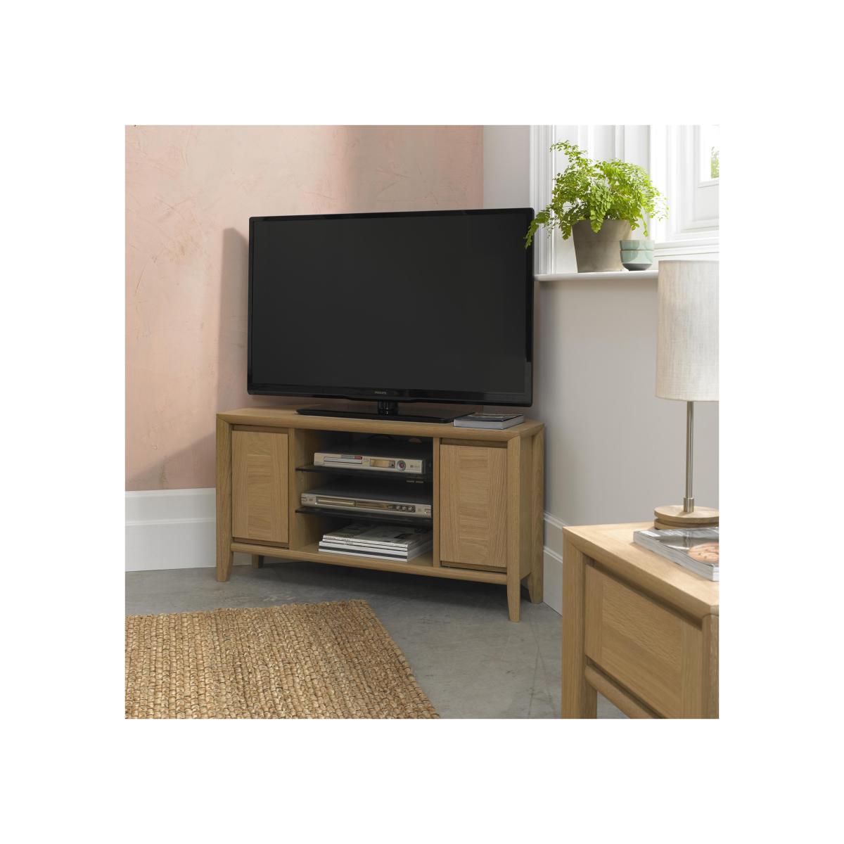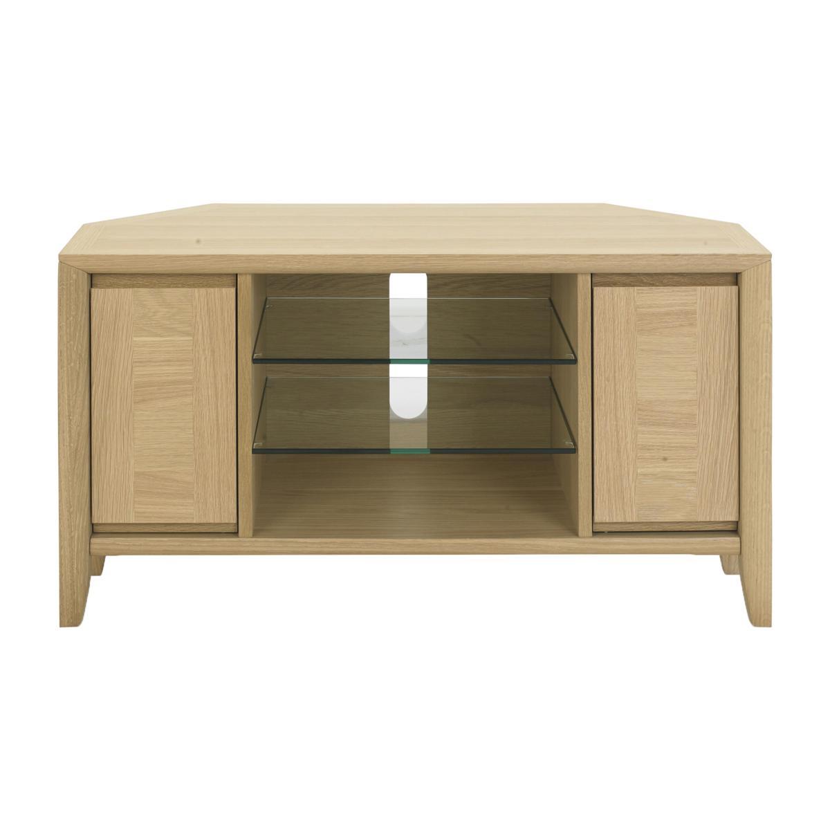 Surprisingly spacious yet perfect for the smaller living room, the Duplex corner entertainment unit combines elegant lines with superb craftsmanship and all at a great- value price. Youll find it has plenty of room for all your media and gaming components. There are two narrows cupboards, each with a shelf, finished with recessed handles. The central open storage area has two glass shelves, and cables holes at the rear ensure that leads stay neat and tidy. Beautifully functional, this corner TV cabinet is also beautifully made from solid white oak and oak veneer and has gorgeous marquetry patterning on the door fronts. Set on tapered legs and with lovely three- way mitred corner joints, everything about this unit is stylish and well crafted. The Duplex corner entertainment unit is part of the Duplex collection of elegant and affordable compact furniture for living room, dining room and home office.