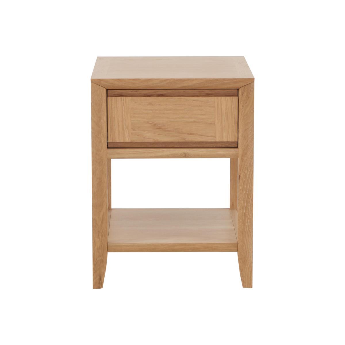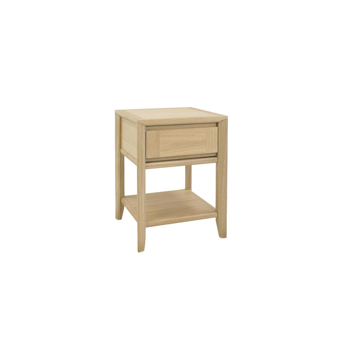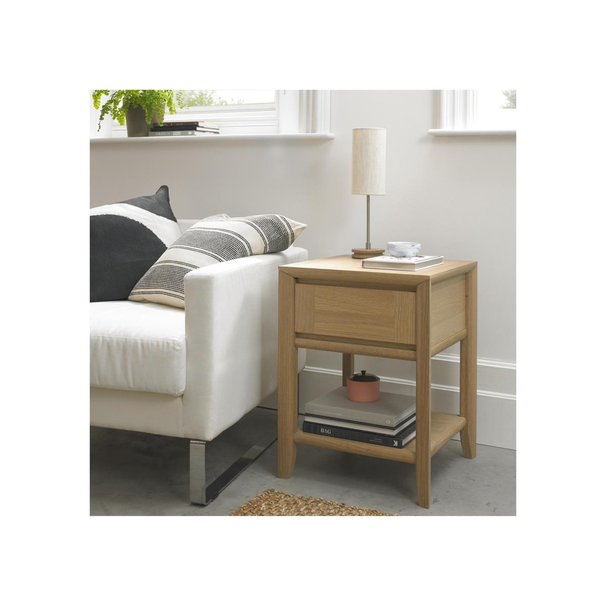 Compact, elegant and versatile, the incredible-value Duplex collection makes it easy to furnish every room in relaxed and elegant style. Offering a wide range of dining room, living room and home office furniture, this stunning collection is thoughtfully designed and beautifully made from solid white oak and white oak veneers. Pieces feature well-crafted and authentic details like marquetry-patterned tops, three-way mitre corner joints, recessed handles, and soft-closing drawers and doors. Choose from three sizes of extending dining table and several styles of dining chair, plus sideboards, occasional tables, entertainment units, and even desks and a filing cabinet. Small but perfectly formed, the Duplex lamp table is beautifully crafted from solid white oak and oak veneer, and features a wealth of detail that makes it a must for any compact living space. It has a useful drawer with Blum soft-close runners and recessed handle, as well as a lower shelf that’s perfect for books. The drawer front, shelf and upper surface are embellished with lovely marquetry patterning. The top and gently tapered legs frame the entire table, a design feature that’s accentuated by the three-way mitred corner joints. The incredible-value Duplex lamp table is part of the Duplex collection of living room, dining room and home office furniture. If you’re searching for compact living room occasional furniture, take a look at the Duplex narrow book case and the Duplex nest of tables.