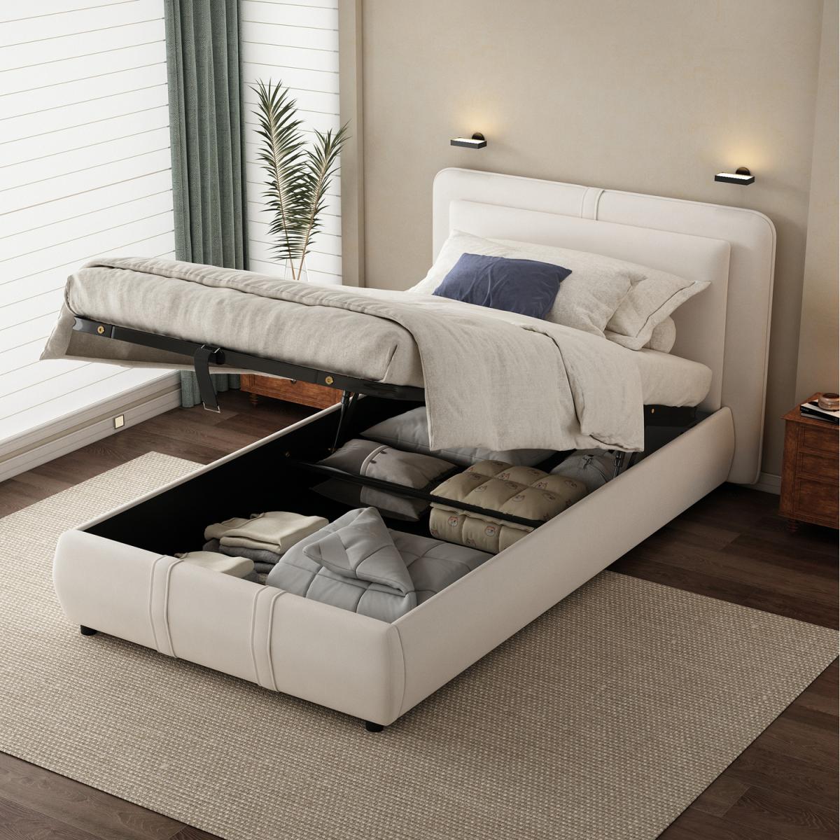 This upholstered bed features a hydraulic storage function,allowing easy access to ample hidden space under the bed,perfect for storing bedding,seasonal items, or clutter while saving room. Sized at 90X190cm 3ft single bed,it offers ample space for a restful sleep,making it ideal for a wide range of users. Crafted with a combination of velvet for a soft surface and plywood for structural strength,the bed is built to be durable and sturdy,ensuring long term reliability. Equipped with a removable soft headboard backrest,offering versatility to adapt to different preferences or space requirements. Detailed instructions and complete parts are available to help you complete the assembly. The fun of installation makes you enjoy the bed more.
