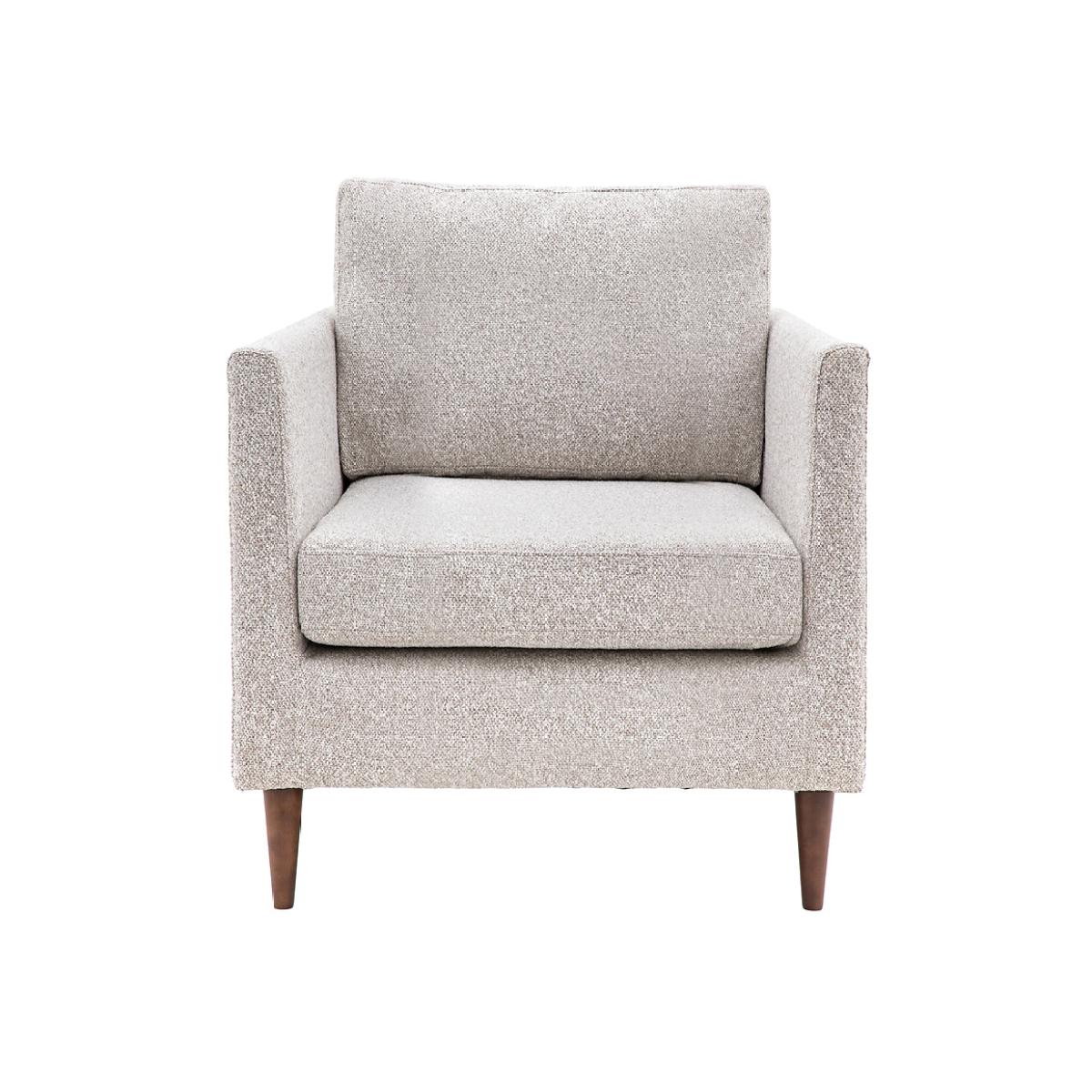This contemporary armchair offers a simple stylish design which would suit a wide range of interiors. Upholstered in a beautifully soft fabric with deep seat and back cushions for comfort, the turned wooden legs thoughtfully echo the shape of the gently tapered arms. Product details• Soft Brushed Upholstery• Beech legs• Pine Frame• Single seat• Seat Filling - Foam• Back Filling - Foam• Seat Firmness - Medium• Back Firmness - Medium• 12 month manufactuers warranty. Product Composition - Pine 45% / Foam 23% / Fabric 13% / Plywood 10% / Beech 9%Product Dimensions - 84 cm x 77 cm x 84 cm , Weight - 24.4 KGSeat Height - 45 cm. Seat Width-58 cm. Seat Depth - 54 cm Leg / Feet Height - 15.5 cm Clearance to Floor - 15.5 cm Package Dimensions - 88 cm x 80 cm x 58 cm, Weight 28.9 kg. This product will be dispatched by one of our trusted suppliers. You’ll be contacted by their selected courier about your delivery. Please note: this product cannot be delivered to all Offshore Islands, Northern Ireland or Republic of Ireland. GALLE01