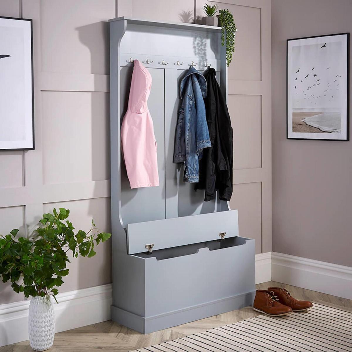 I love this grey hall stand because it combines functionality with classic charm, making it an ideal piece for both modern and traditional interiors. Its neutral tone ensures versatility, working well in entrance areas that need organisation without compromising style. The hooks are perfect for coats and bags, while the shoe storage at the bottom keeps clutter out of sight. To style it effectively, consider adding a mirror above or nearby to make the space feel bigger and more practical - a great spot for last-minute grooming checks. Pair it with a cosy rug and some greenery or artwork to create a welcoming, clutter-free entry point that’s both practical and visually appealing.