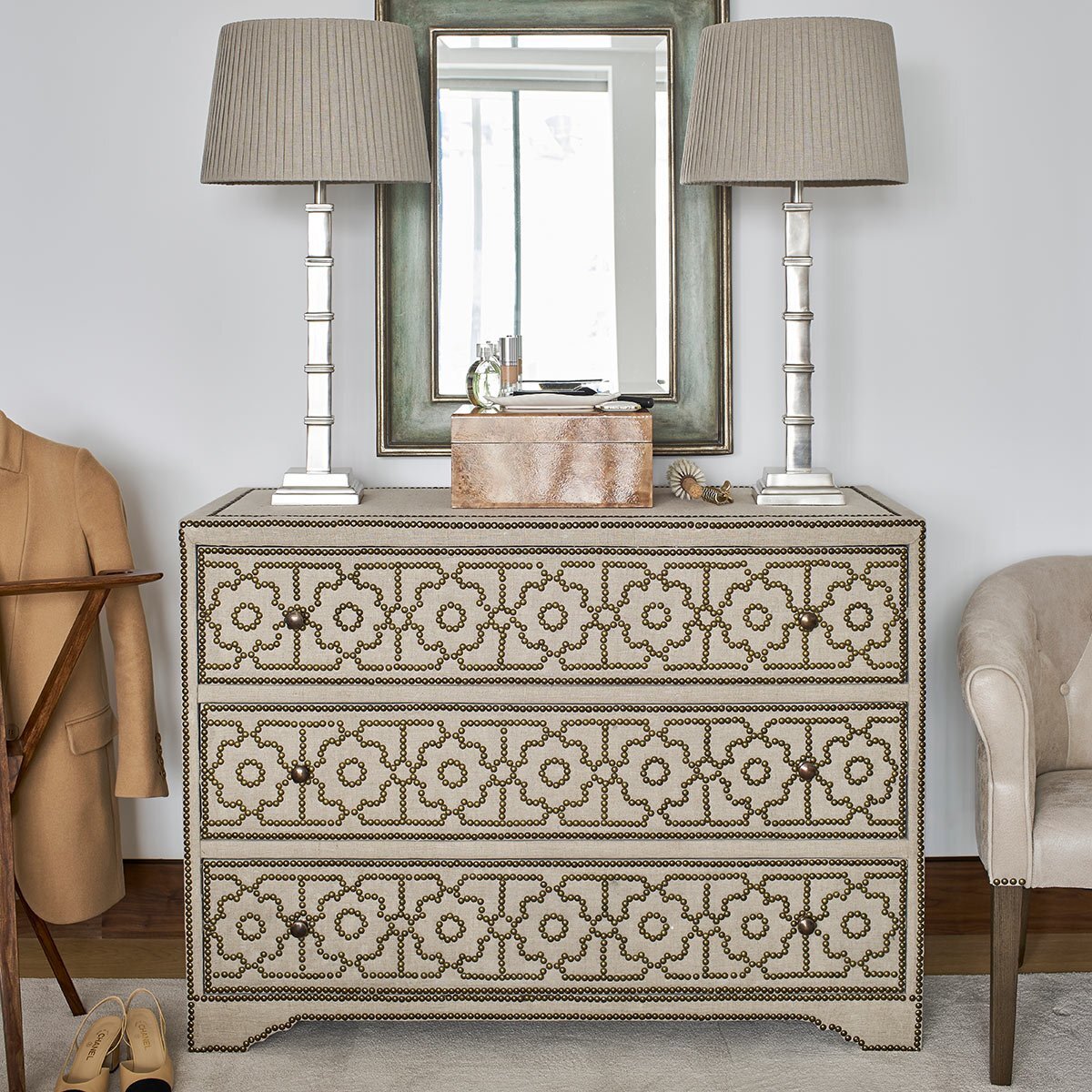 If a unique, showstopping chest of drawers is what you've been searching for, look no further than our Durbar design. A beautifully balanced piece, the natural material and studded floral design on the drawer fronts combine to make a real statement.