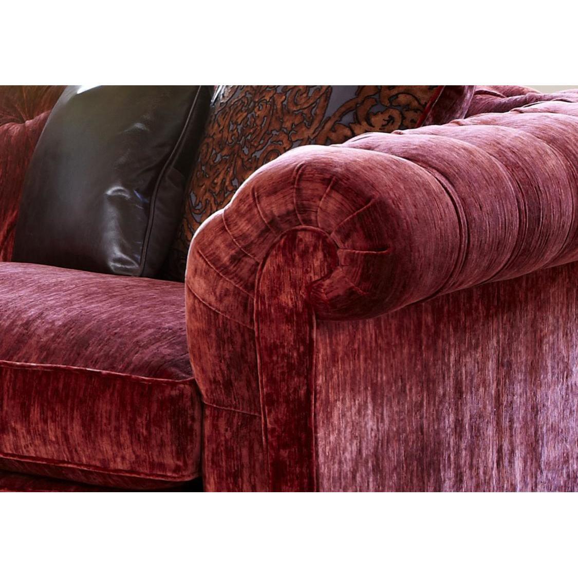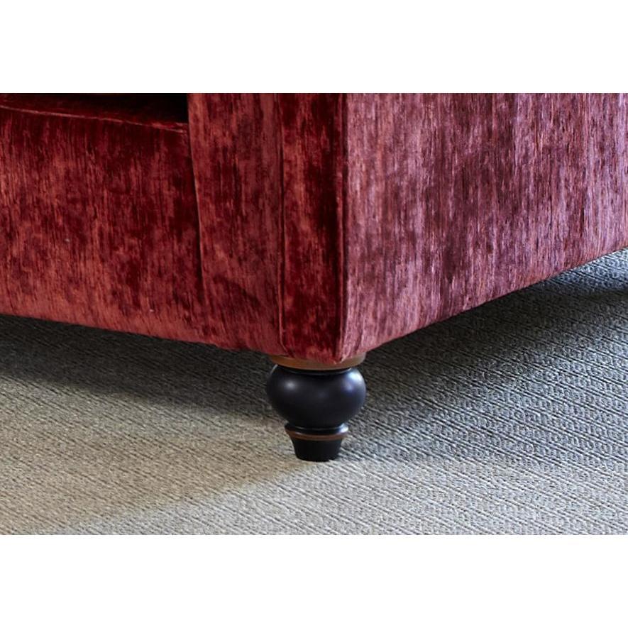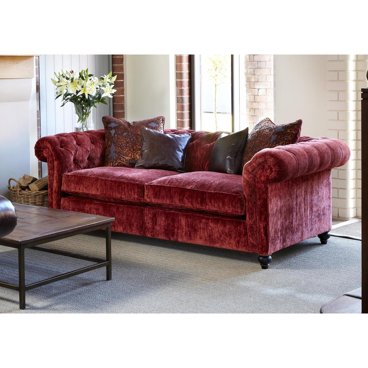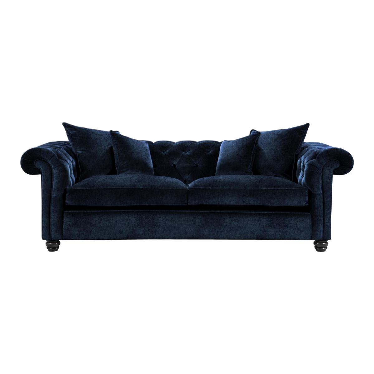 Seats at least 4 in relaxed British style. Classic Chesterfield design, stylishly reimagined by Duresta. Hardwood frame and upholstered in a soft, luxurious fabric. Fixed back and arms with deep, hand-pulled buttoning. Serpentine sprung back, coil sprung seat with sprung edge. Fibre seat cushions and 4 duck feather scatters in two sizes. Removable turned wooden feet with a polished, antique finish