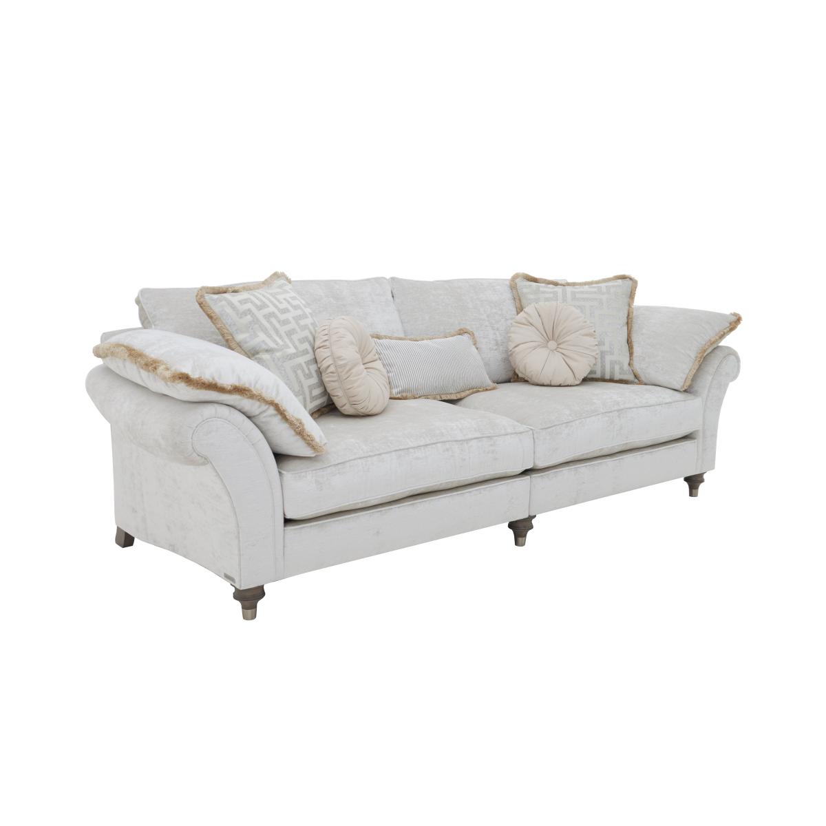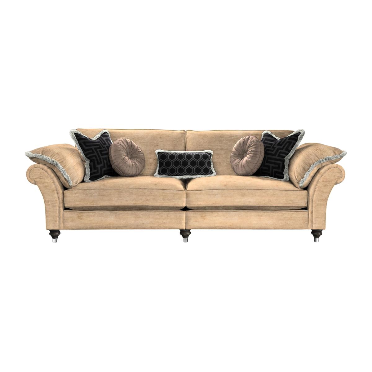 Grand, glam and gorgeous, this beautiful Duresta four-seater sofa comes with a set of accent cushions. Choose from a wide range of exclusive upholstery fabrics. Why you’ll love it Simply stunning Duresta style. Superb comfort, sumptuous curves and a wealth of glam details. Extravagantly rolled arms have sumptuous feather-filled and ruched arm cushions. This sofa comes with 5 statement accent cushions in coordinating fabrics. 2 large reversible scatters with ruched edges, 2 pinwheel cushions and 1 lumbar cushion. Ruched-edge cushions are available with piping instead, if preferred. In a huge choice of exceptional upholstery fabrics handpicked for Furniture Village. Fabrics are sourced from specialist weaving mills in Belgium and Italy. Turned solid wood legs in a choice of finish. Optional brushed brass or brushed steel leg tips. Expertly handcrafted using traditional techniques and the highest-quality materials. Superb seat cushioning offers the support of foam with the softness of fibre. Reversible seat and back cushions stay beautiful for longer. Sprung seating platform has a firm front edge for longer frame and cushion life. 25-year frame guarantee. For ease of access, this grand 4-seater sofa has a split frame. Made in England. This grand 4-seater sofa is part of our Duresta Princeton range. What you need to know Medium comfort level. Seat suspension: serpentine springs with fishmouth-spring front edge. Seat cushioning: Supawrap – foam core with a fibre wrap. Cushioning is reversible. Back suspension: serpentine springs. Back cushioning: fibre. Cushioning is reversible. Pinwheel accent cushions: fibre filling. Other accent cushions: feather filling. Plump, turn and rotate seat and back cushions to promote longer cushion life. Some fabrics can show wear on areas of more use or in direct sunlight. Clean regularly using a soft brush or vacuum with the curtain attachment. Deal with any spills promptly. Professional cleaning advised for oil- and grease-based stains. Please read our upholstery care guide for more advice.