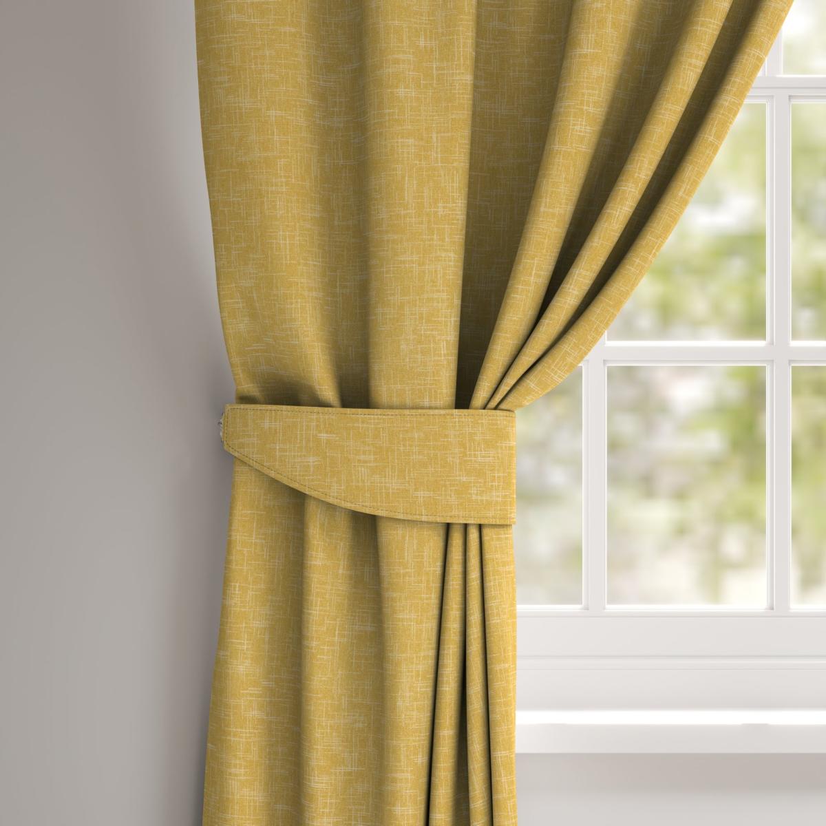 Give your curtains an inviting warming look with our Dusk Pattern Made to Order Tiebacks. Meticulously crafted from fire-retardant fabric, these tiebacks seamlessly blend safety and style, ensuring a tidy and polished appearance for your curtains. Available individually, each tieback offers the choice of a sleek plain or an elegant piped edge, allowing you to customise the look to suit your preferences. The versatile Dusk design invites sunshine indoors with its subtle textured pattern in a warm sunshine colourway. Dusk effortlessly complements any room setting, adding texture, colour, and warmth to your space. This design adds a modern touch to any room, making these tiebacks suitable for both residential and commercial use. Proudly made in the UK, Dusk Pattern Made to Order Tiebacks bring quality and sophistication to your window treatments. Available in both a plain and piped design, this tieback can be paired with our matching Made to Measure Curtain to give your home, office or commercial space a beautifully co-ordinated finish. Book an appointment with one of our expert consultants who will guide you through the process of creating your very own Made to Order Tieback. *If you are unsure on testing requirements for your chosen environment, check with a qualified fire officer what testing is required & that this meets your needs.