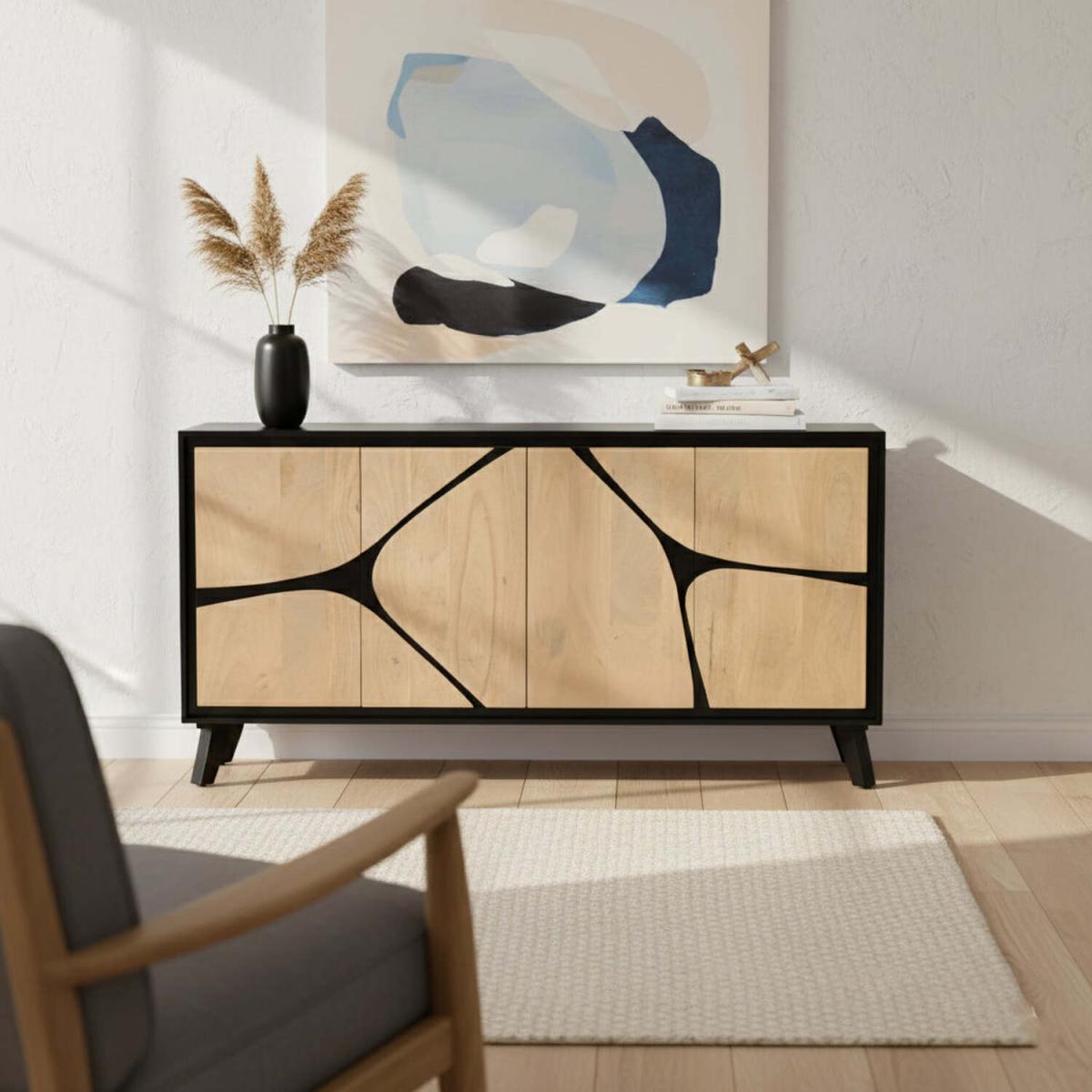 The Dusk Solid Mango wood two tone wide Sideboard is a stunning fusion of art and functionality, designed to elevate the aesthetic of any modern living space. Crafted from high-quality solid mango wood engineering wood, this sideboard features a striking contrast between its natural wood grain doors and a sleek, black finish. The doors are adorned with an intricate, abstract black inlay that creates a captivating, organic pattern, making each piece uniquely beautiful. With its generous dimensions, the sideboard provides ample storage for all your dining essentials, from crockery and glassware to linens and serving dishes. The Sideboard features two shelves in the middle dividing the compartment into upper and lower shelf for ease of storage. The sturdy construction and timeless design ensure this piece will be a cherished part of your home for years to come. Arriving with only partial assembly required, setting up this statement piece is a breeze.
