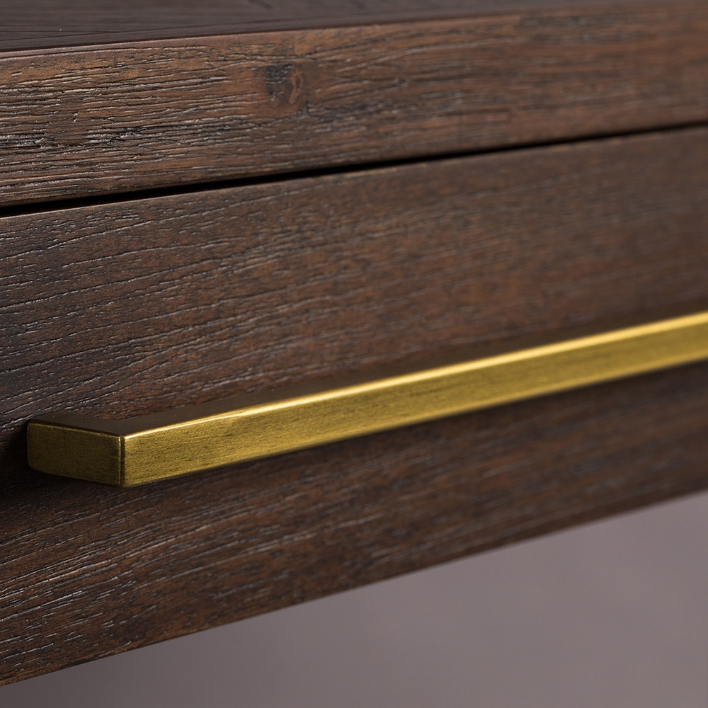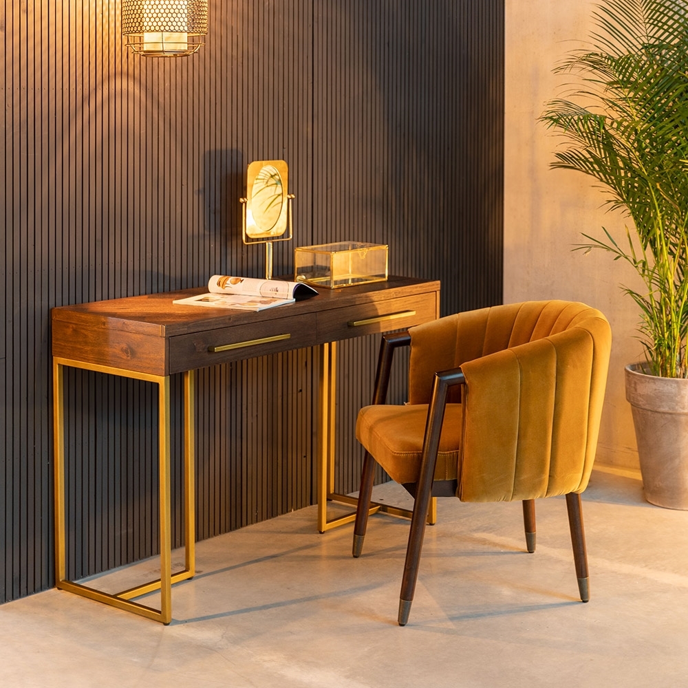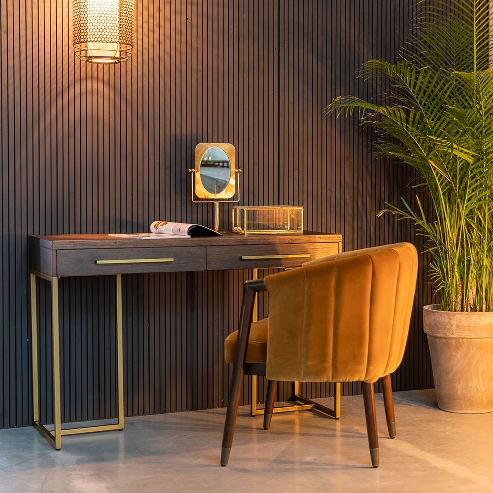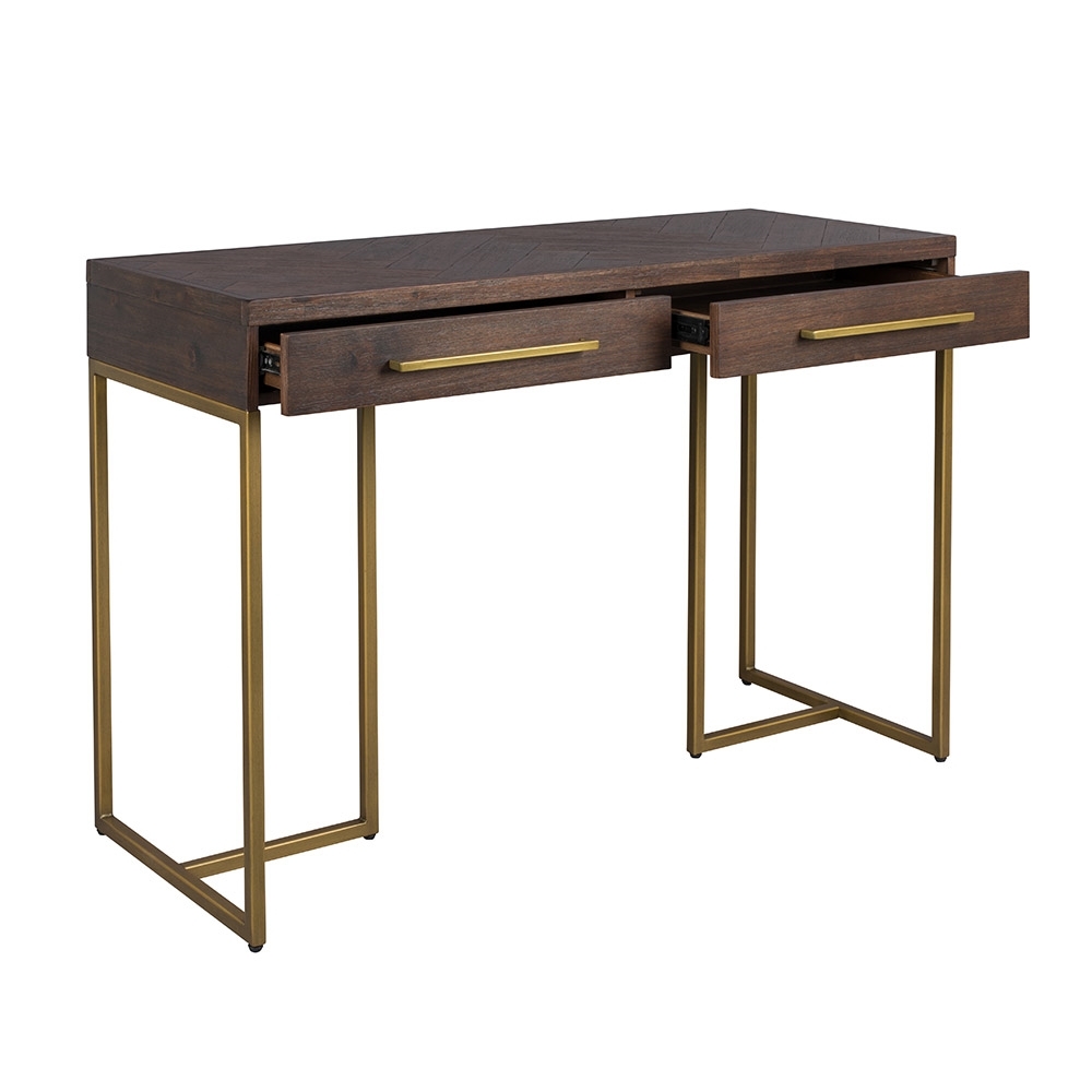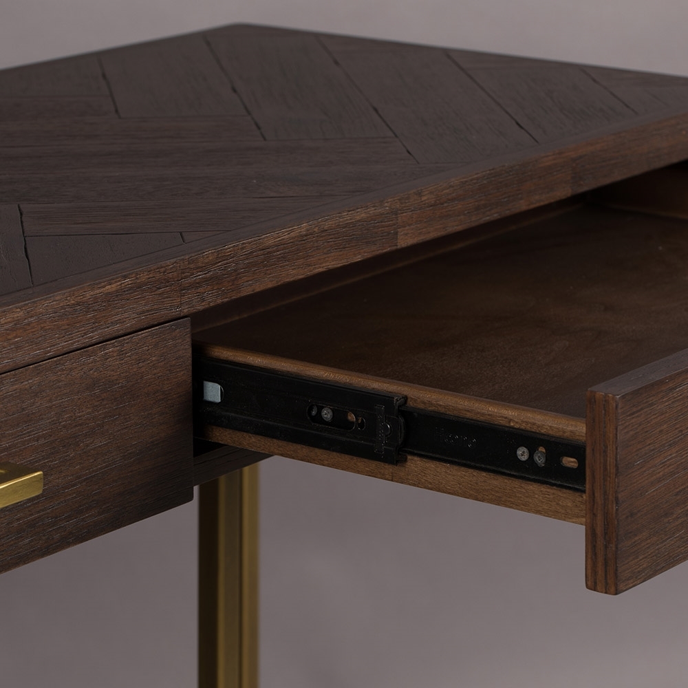 Add some extra storage to your hallway with the Class Console Table from Dutchbone, this stylish table will be the perfect spot to pop your keys as you walk through the door. Finished with a dark acacia wood veneer and a stunning herringbone pattern tabletop, wherever you choose to use Class it is sure to add a retro feel whilst the antique brass details add a touch of elegance. Place in the hallway, living room or even use as a desk, with two drawers it will be ideal for holding all those knick knacks. Pair with other pieces from the Class range to create a gorgeous look throughout your home.
