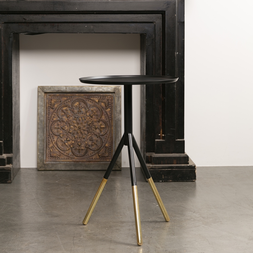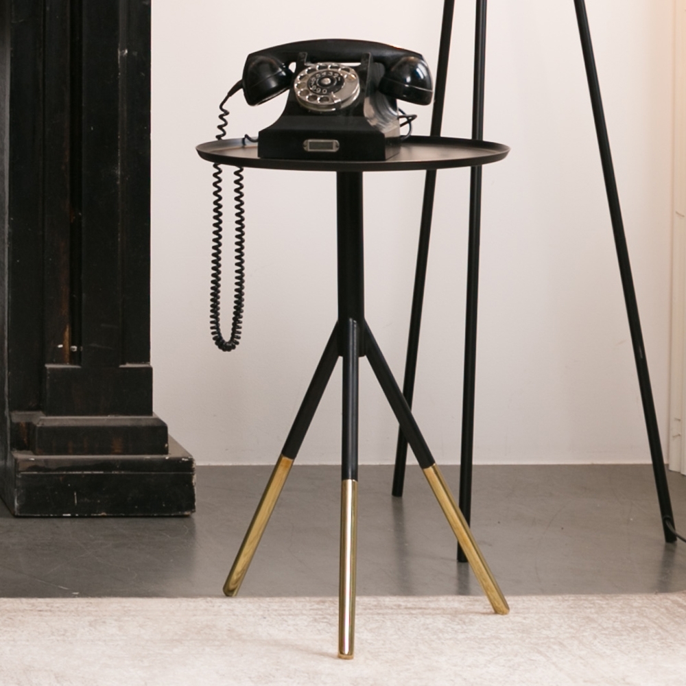 The dip-dyed trend reaches. Furniture. In the cool and quirky Elia Side Table from Dutchbone! She's made of black powder-coated iron with brass feet, giving the effect of having been dipped in gold! With a strong and sturdy 3 legged design, Elia is a stylish and versatile addition to your bedside, lounge or hallway, and looks even better accessorised with one of our retro telephones!.
