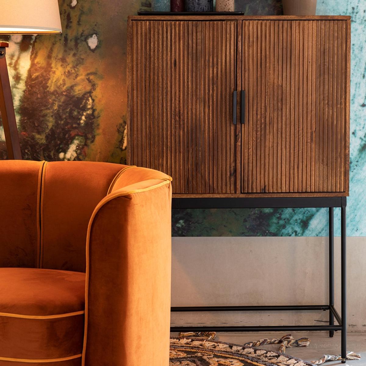 I love this cabinet for its blend of warm wood tones and sleek black metal legs, which makes it a versatile piece that can suit both contemporary and retro interiors. It’s a practical choice for those wanting to add storage for their drinks without compromising style, especially in open-plan living spaces or dining rooms. To style it, consider placing some glassware or decorative bottles on top, alongside a statement table lamp or a small plant for visual interest. Inside, it’s perfect for organising bottles, glasses, or bar accessories, keeping everything tidy yet stylish. Its compact size and elegant design make it an easy fit in smaller spaces, or as a focal point in a larger room.