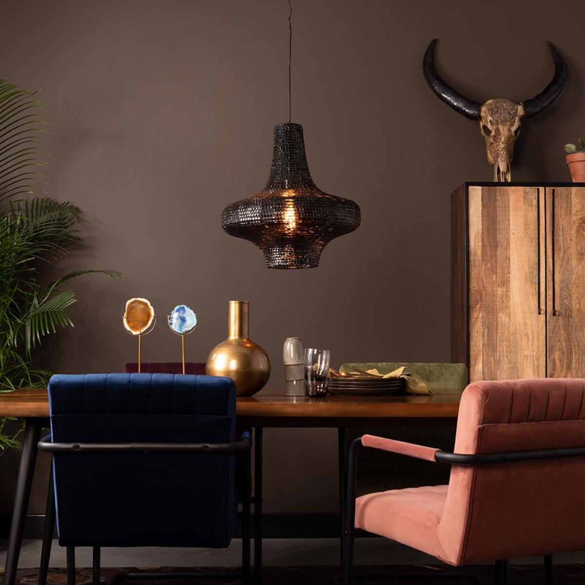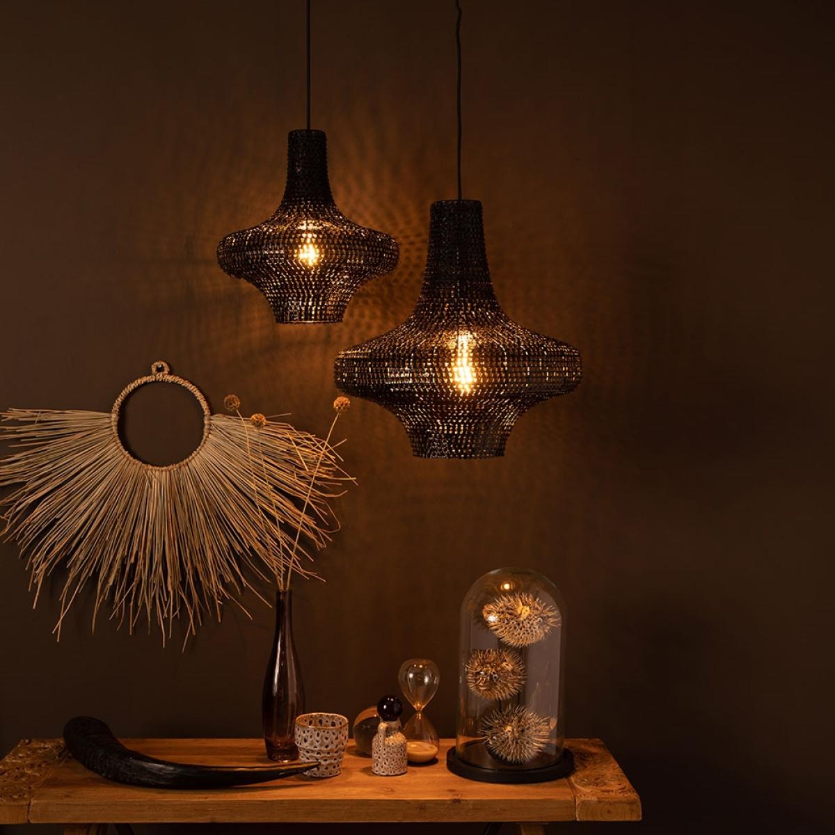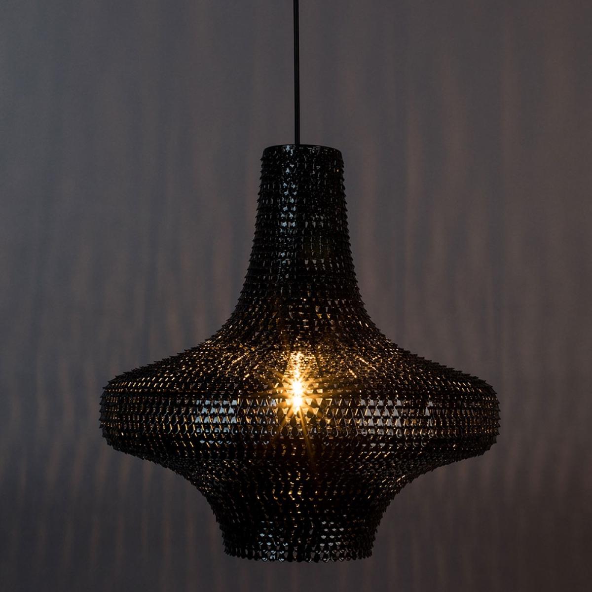 The stunning design of the Trooper Pendant Lamp is sure to make an impact in your home. Handmade from tiny pieces of metal with a shiny black finish, the curved shape certainly will look impressive over a dining table or breakfast bar. Keep them apart to make a coordinating lighting scheme or hang them side by side to create a gorgeous feature in your home.
