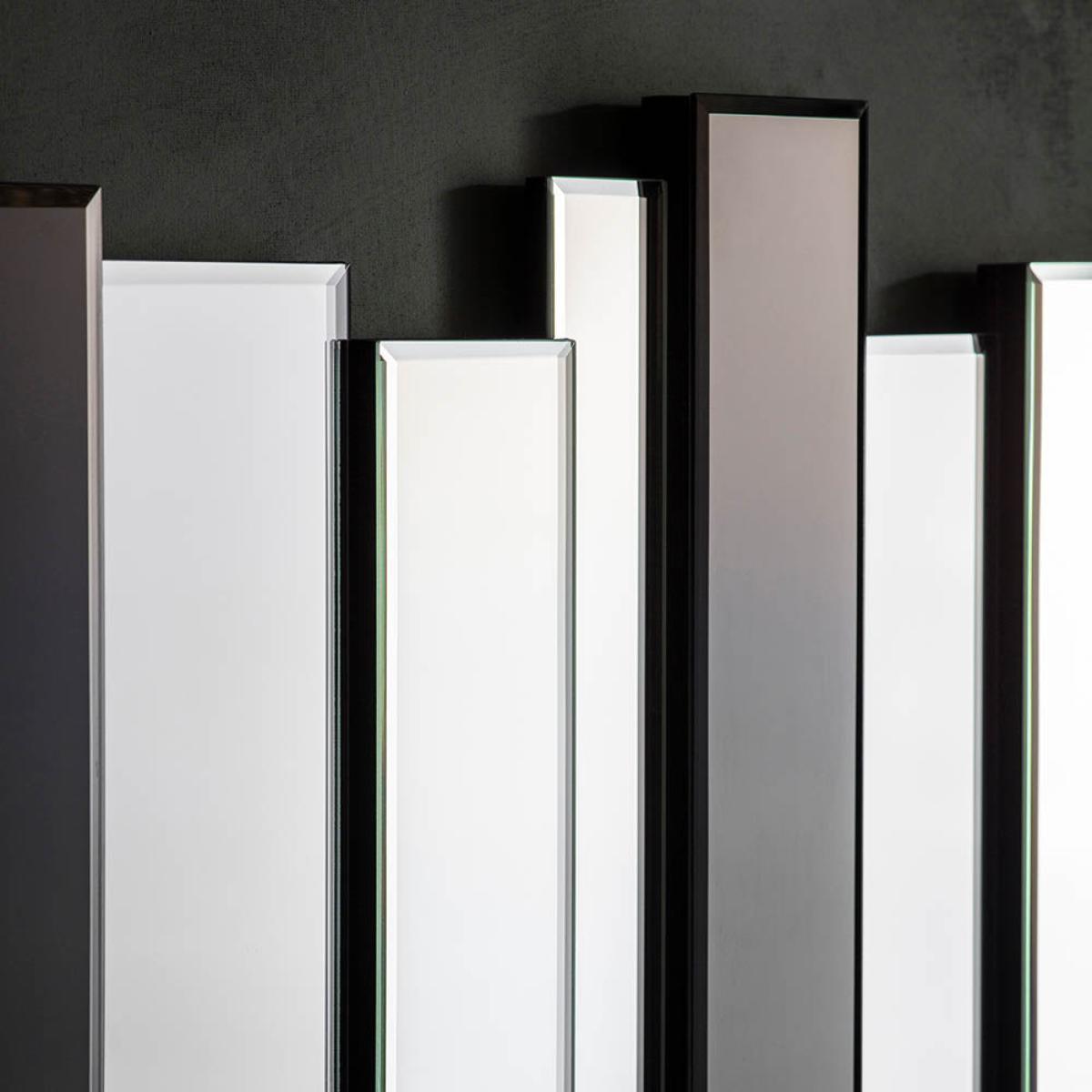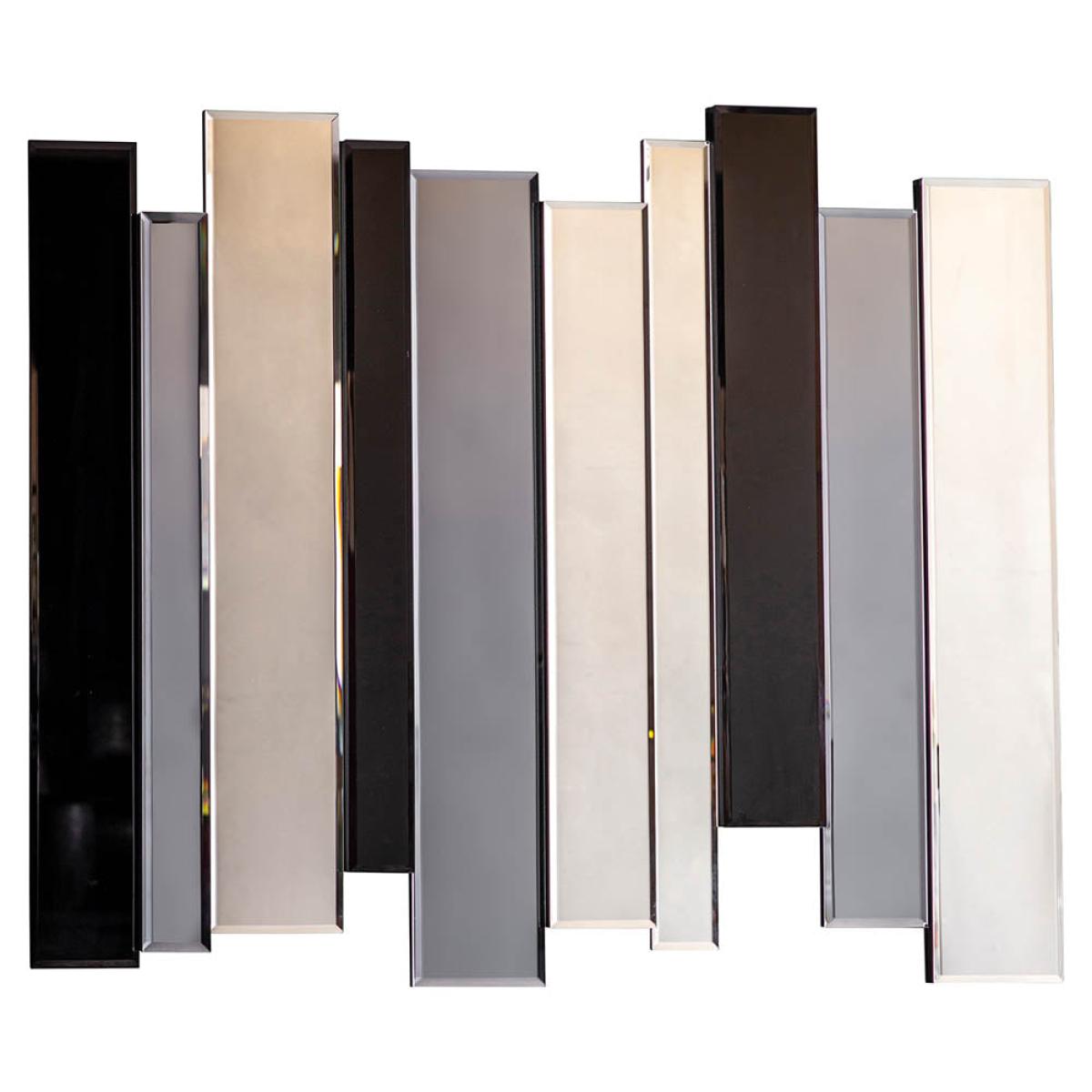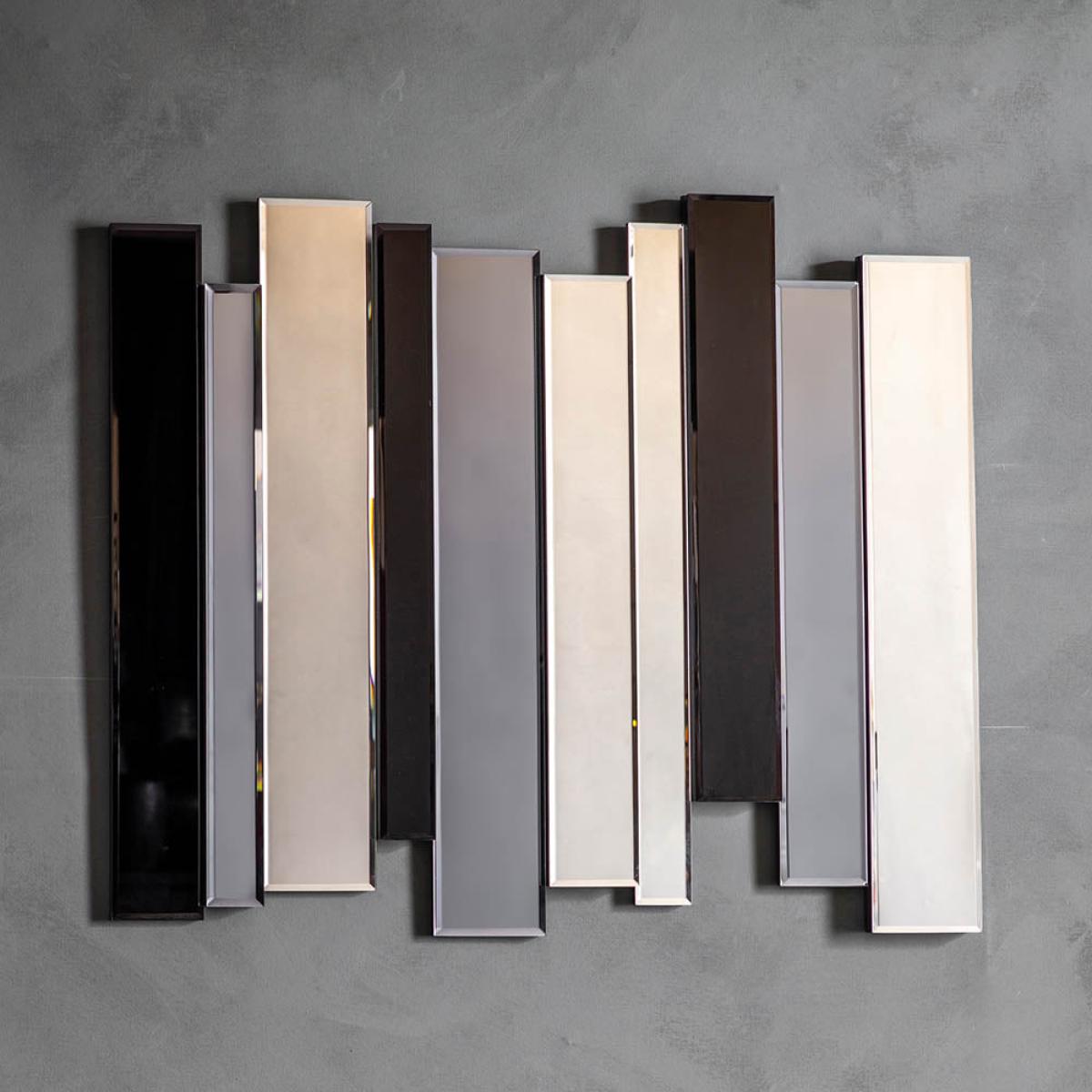 Decorative wall mirror featuring a series of mirrored panels, in clear, smoked and black glass.