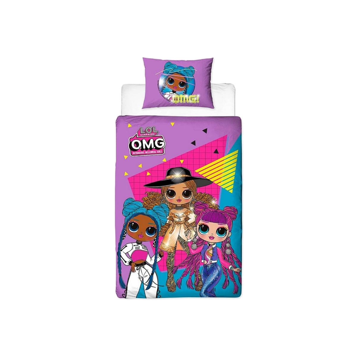 This official L.O.L Surprise OMG Beat Single Duvet Cover Set is ideal for any fans of the collectable dolls. The fun design features Da Boss, Roller Chick and Chillax from the Outrageous Millennials range, on a purple, blue, pink and yellow background which also features the L.O.L Surprise logo. The reverse features blue, white and yellow lines with small triangles as well as the words 'Dance Bbs' on a dark pink background. This bedding set is made from a polycotton mix and is suitable for machine washing and tumble drying on a cool setting.