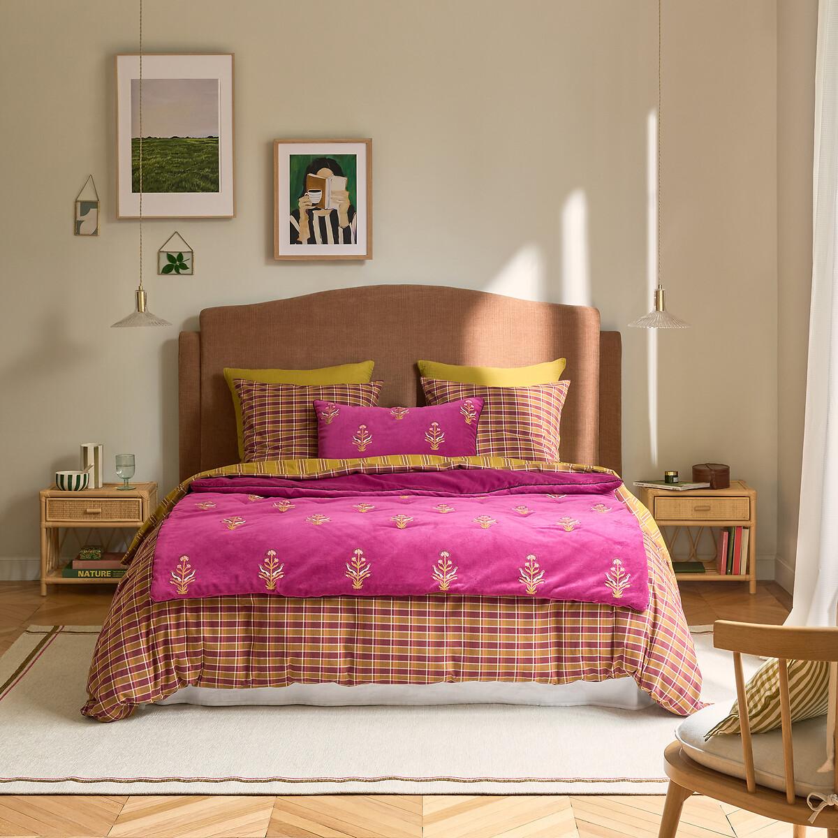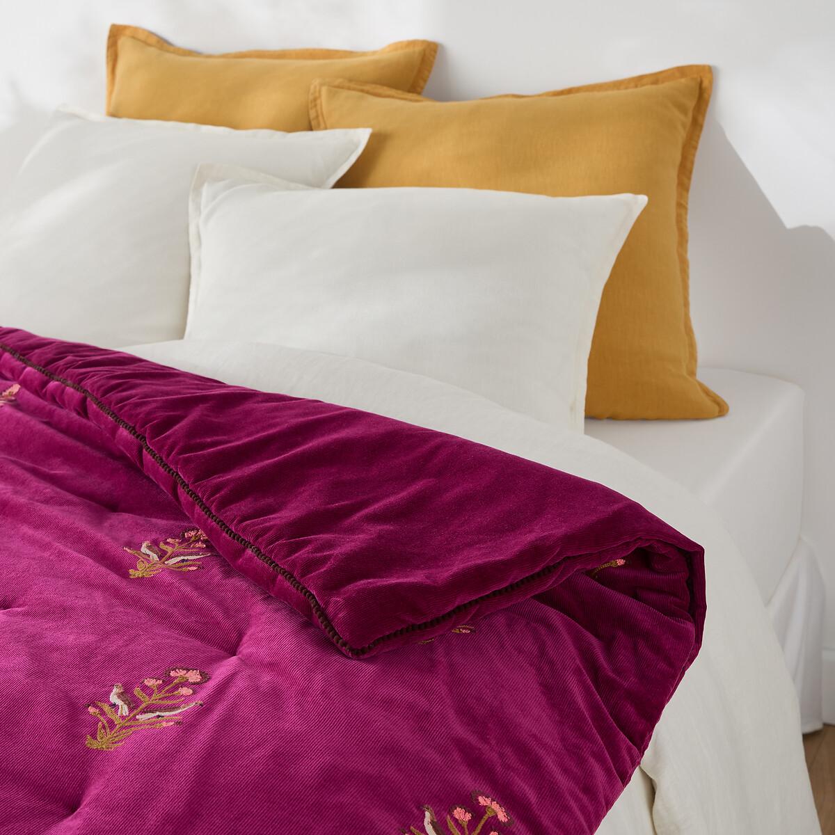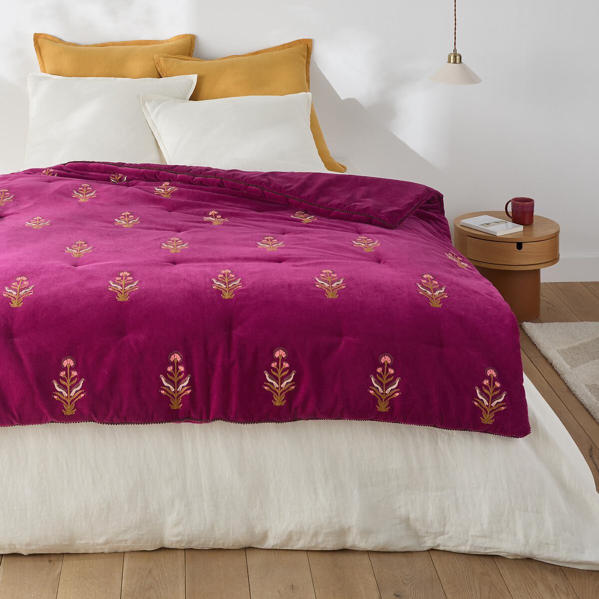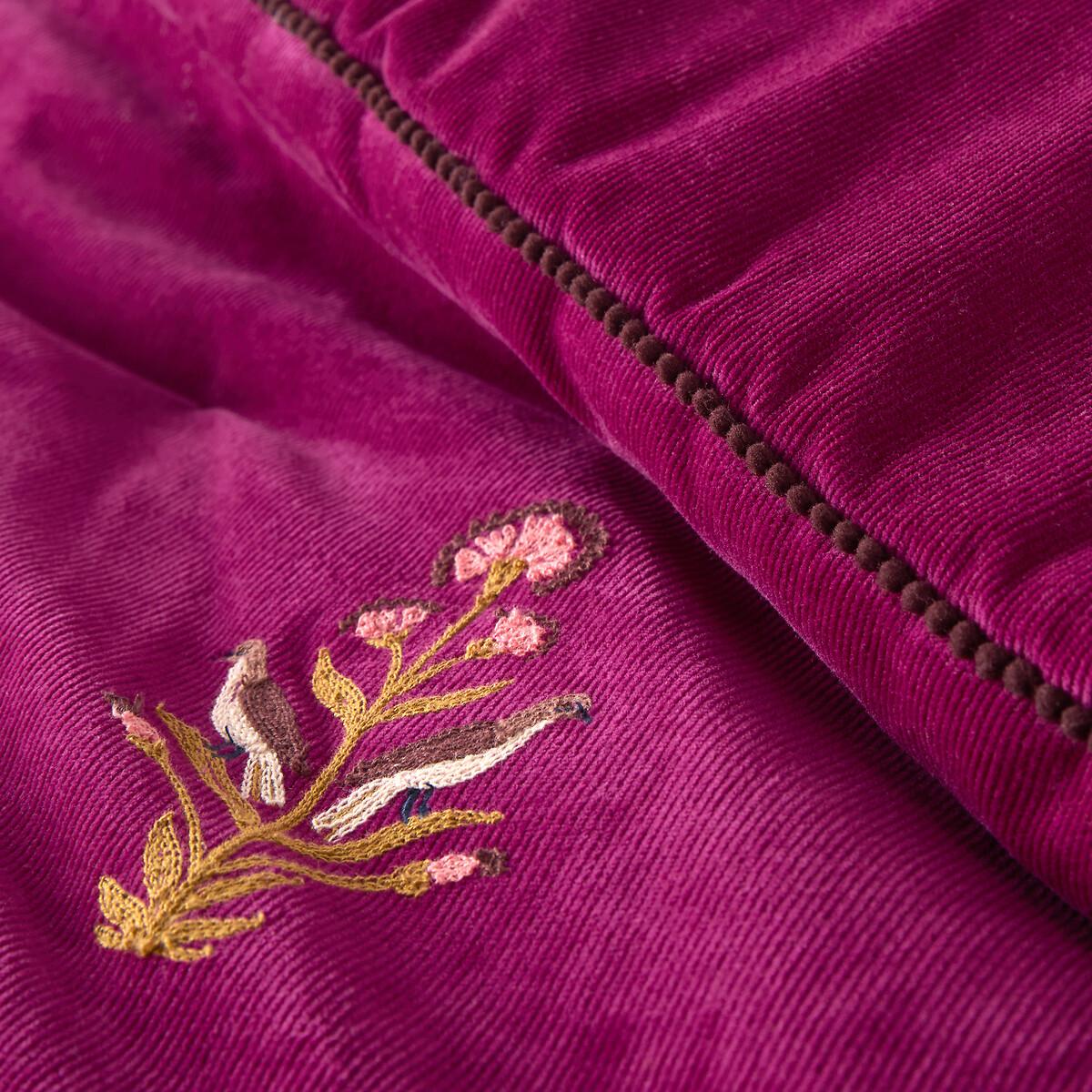 The Dylis quilted bedspread features ribbed velvet and chain stitch embroidered designs. The contrast of the pompom bias on the outline gives it a bohemian aesthetic which reinvents the atmosphere of the room. Cotton is part of our daily lives. We love it for its suppleness and softness. Easy Care, it is ideal for the beds of young and old alike!Product Details • 100% cotton cover • Cotton velour • 100% polyester filling (250gr/m²) • Front corduroy embroidery with flowers and birds in chain stitch • Plain corduroy reverse • Pompom bias finish on the edge. Care Advice • Hand wash. Dimensions • 90 x 190cm • 150 x 150cm