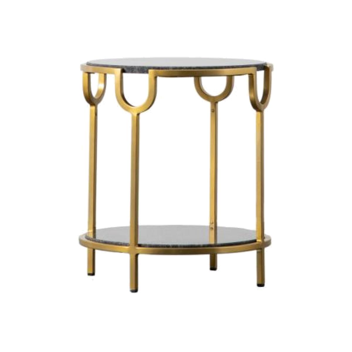 Add a touch of Luxe to a room with this beautiful side table which combines natural stone with a metal frame to create this stunning piece. The frame features eye-catching design detail around the top to add interest and has a brushed brass finish, which pairs beautifully with the black granite. There is a matching side table, and both are also available with white marble. Material: Stone. Colour/Finish: Black.