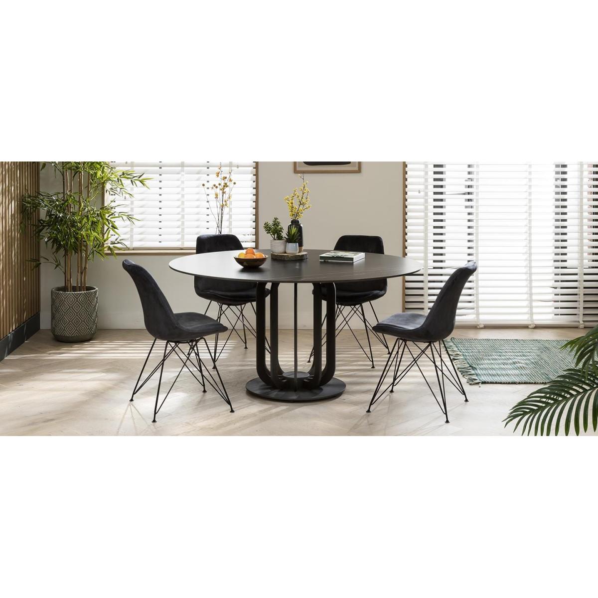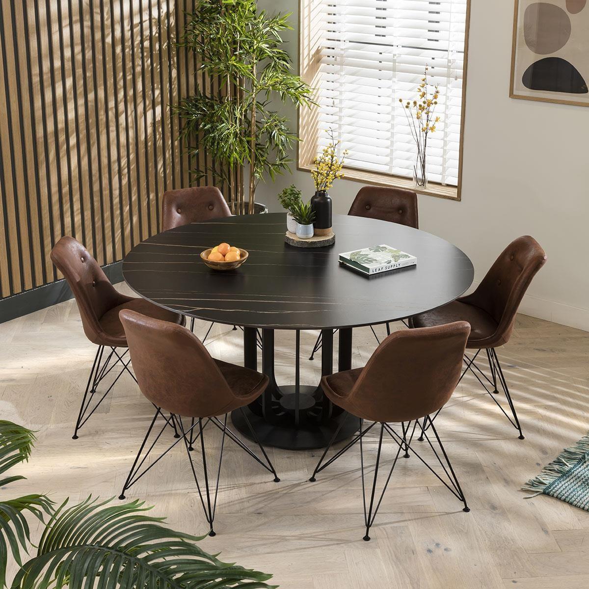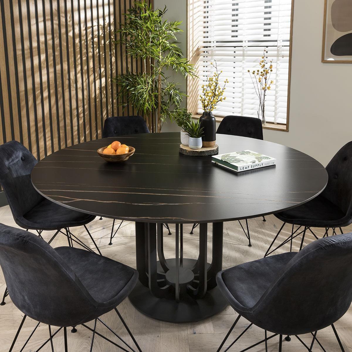 Featuring a premium black ceramic marble top adorned with exquisite gold details, our 6 seater table has a 150cm top, supported by a unique metal pedestal base. Crafted with durability in mind, the ceramic top is scratch, stain and heat resistant. Redefine your dining space with Dynasty—a masterpiece in every meal. The unique cylindrical blade design of the pedestal base sets this 6 seater dining table apart, marrying form and function seamlessly. This design not only lends stability but also adds a touch of contemporary flair to your dining space. The juxtaposition of the black marble-effect with gold accents against the dark powder-coated metal creates a striking visual harmony, making Dynasty a conversation starter at any gathering. Elevate your dining experience with the perfect blend of opulence and resilience. The Dynasty dining table, with its meticulous craftsmanship and innovative design, transforms your dining area into a haven of modern luxury. Whether hosting intimate dinners or grand celebrations, Dynasty stands as a testament to your discerning taste, promising enduring elegance for years to come. W150cm D150cm H76cm 6 Seater Designer Round Dining Table Ceramic is scratch, stain and heat resistant