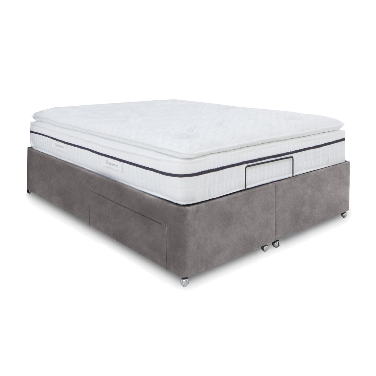 The next generation of adjustable beds is here. The adjustable bed frames and divan bases in our E-Motion collection do far more than you might expect. Opt for one with built-in massage functionality for even more relaxation. Dual-adjustable bases mean that both sides of the bed can be operated independently to suit each partner’s comfort needs. And thanks to smooth electric-powered mechanisms and wireless remote controls, finding the perfect position is smooth and simple. The E-Motion collection includes a wide range of stylish upholstered bed frames, divan bases complete with headboards and mattresses. Made in the UK and only at Furniture Village. Make life easier and infinitely more comfortable with this adjustable divan base, beautifully upholstered in a choice of fabrics. Why you'll love it Find perfect comfort for better sleep with this adjustable divan base. A simple wireless handset makes this bed so easy to adjust. Use the handy memory function to quickly return to your favourite comfort position. There’s even a weightless-feel pre-set position for TV watching. This divan base promotes restorative sleep by minimising discomfort that might wake you up. Adjustable beds can also reduce back ache, improve blood circulation and reduce snoring. It’s ideal if you need a little help getting in and out of bed. An ethical choice – this divan base is made with FSC-sourced wood. With optional storage drawers in a range of configurations. In a wide selection of fashionable upholstery fabric options. Designed and handcrafted just for Furniture Village. Made in the UK. Also available with 2-person adjustability and massage function. And with a choice of stylish, luxuriously cushioned headboards. This adjustable divan base is part of our E-Motion range. What you need to know Mattress sold separately. To ensure bed base and mattress compatibility, consider a mattress from the E-Motion range. Please check the suitability of any mattress you are considering for this adjustable base. Available in single and king sizes. Do not sit on this adjustable bed with the foot end in a raised position. Clean regularly using a soft brush or vacuum with the curtain attachment. Deal with any spills promptly. Professional cleaning advised for oil- and grease-based stains. Some fabrics can show wear on areas of more use or in direct sunlight. Shop our E-Motion range for a huge choice of bed frames, divan bases, massage beds, mattresses and more.