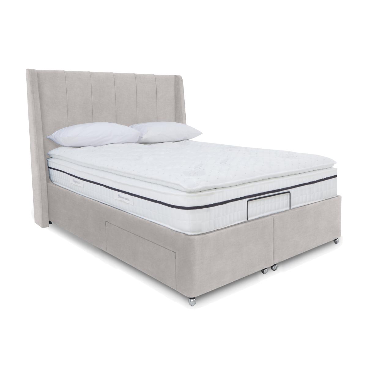 Enjoy modern glam bedroom style and perfectly personalised comfort with an adjustable divan bed base from our Akira range. Electric-powered for the smoothest of movements and with multi-setting remote control operation, these divan bases represent the height of adjustable bed technology. And because each comes complete with a beautifully upholstered and decidedly sumptuous headboard, they also score top marks for contemporary style. Bed bases are available in a choice of sizes and offer optional built-in storage and massage functionality. The range also includes dual bases. Designed and handcrafted exclusively for Furniture Village, the Akira range is part of our E-Motion adjustable bed collection. Enjoy truly personalised sleeping comfort with this beautifully upholstered adjustable divan base with optional storage drawers. The modern glam Akira winged headboard is included. Why you'll love it Find perfect comfort for better sleep with this adjustable divan base. This divan base comes with our modern glam Akira winged headboard. A simple wireless handset makes this bed so easy to adjust. Use the handy memory function to quickly return to your favourite comfort position. There’s even a weightless-feel pre-set position for TV watching. This divan base promotes restorative sleep by minimising discomfort that might wake you up. Adjustable beds can also reduce back ache, improve blood circulation and reduce snoring. It’s ideal if you need a little help getting in and out of bed. An ethical choice – this divan base is made with FSC-sourced wood. With optional storage drawers in a range of configurations. In a wide selection of fashionable upholstery fabric options. Designed and handcrafted just for Furniture Village. Made in the UK. Also available with 2-person adjustability and massage function. This adjustable divan base is part of our E-Motion range. What you need to know Mattress sold separately. To ensure bed base and mattress compatibility, consider a mattress from the E-Motion range. Please check the suitability of any mattress you are considering for this adjustable base. Available in single and king sizes. Do not sit on this adjustable bed with the foot end in a raised position. Clean regularly using a soft brush or vacuum with the curtain attachment. Deal with any spills promptly. Professional cleaning advised for oil- and grease-based stains. Some fabrics can show wear on areas of more use or in direct sunlight. Shop our E-Motion range for a huge choice of bed frames, divan bases, massage beds, mattresses and more.