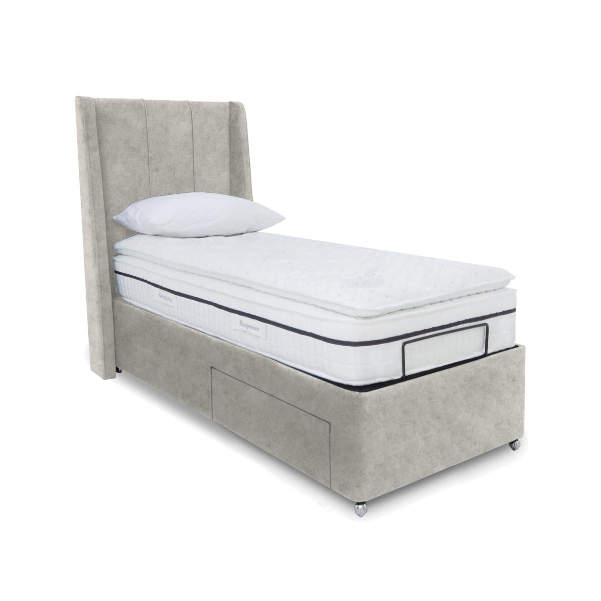 Enjoy modern glam bedroom style and perfectly personalised comfort with an adjustable divan bed base from our Akira range. Electric-powered for the smoothest of movements and with multi-setting remote control operation, these divan bases represent the height of adjustable bed technology. And because each comes complete with a beautifully upholstered and decidedly sumptuous headboard, they also score top marks for contemporary style. Bed bases are available in a choice of sizes and offer optional built-in storage and massage functionality. The range also includes dual bases. Designed and handcrafted exclusively for Furniture Village, the Akira range is part of our E-Motion adjustable bed collection. Enjoy truly personalised sleeping comfort with this beautifully upholstered adjustable divan base with optional storage drawers. The modern glam Akira winged headboard is included. Why you'll love it Find perfect comfort for better sleep with this adjustable divan base. This divan base comes with our modern glam Akira winged headboard. A simple wireless handset makes this bed so easy to adjust. Use the handy memory function to quickly return to your favourite comfort position. There’s even a weightless-feel pre-set position for TV watching. This divan base promotes restorative sleep by minimising discomfort that might wake you up. Adjustable beds can also reduce back ache, improve blood circulation and reduce snoring. It’s ideal if you need a little help getting in and out of bed. An ethical choice – this divan base is made with FSC-sourced wood. With optional storage drawers in a range of configurations. In a wide selection of fashionable upholstery fabric options. Designed and handcrafted just for Furniture Village. Made in the UK. Also available with 2-person adjustability and massage function. This adjustable divan base is part of our E-Motion range. What you need to know Mattress sold separately. To ensure bed base and mattress compatibility, consider a mattress from the E-Motion range. Please check the suitability of any mattress you are considering for this adjustable base. Available in single and king sizes. Do not sit on this adjustable bed with the foot end in a raised position. Clean regularly using a soft brush or vacuum with the curtain attachment. Deal with any spills promptly. Professional cleaning advised for oil- and grease-based stains. Some fabrics can show wear on areas of more use or in direct sunlight. Shop our E-Motion range for a huge choice of bed frames, divan bases, massage beds, mattresses and more.