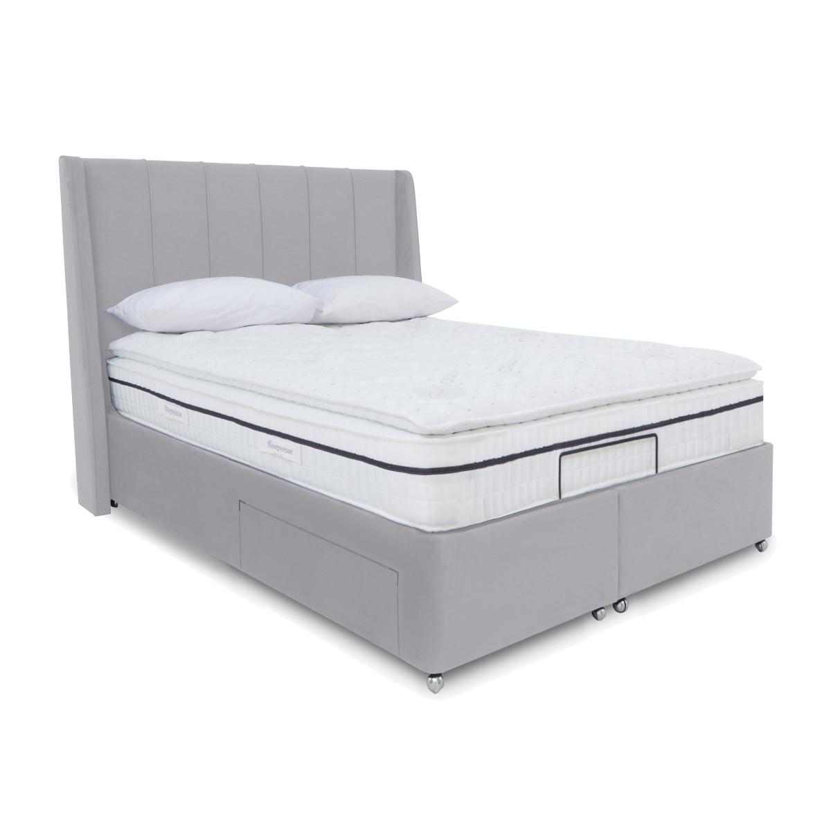 Enjoy modern glam bedroom style and perfectly personalised comfort with an adjustable divan bed base from our Akira range. Electric-powered for the smoothest of movements and with multi-setting remote control operation, these divan bases represent the height of adjustable bed technology. And because each comes complete with a beautifully upholstered and decidedly sumptuous headboard, they also score top marks for contemporary style. Bed bases are available in a choice of sizes and offer optional built-in storage and massage functionality. The range also includes dual bases. Designed and handcrafted exclusively for Furniture Village, the Akira range is part of our E-Motion adjustable bed collection. Enjoy truly personalised sleeping comfort with this beautifully upholstered adjustable divan base with optional storage drawers. The modern glam Akira winged headboard is included. Why you'll love it Find perfect comfort for better sleep with this adjustable divan base. This divan base comes with our modern glam Akira winged headboard. A simple wireless handset makes this bed so easy to adjust. Use the handy memory function to quickly return to your favourite comfort position. There’s even a weightless-feel pre-set position for TV watching. This divan base promotes restorative sleep by minimising discomfort that might wake you up. Adjustable beds can also reduce back ache, improve blood circulation and reduce snoring. It’s ideal if you need a little help getting in and out of bed. An ethical choice – this divan base is made with FSC-sourced wood. With optional storage drawers in a range of configurations. In a wide selection of fashionable upholstery fabric options. Designed and handcrafted just for Furniture Village. Made in the UK. Also available with 2-person adjustability and massage function. This adjustable divan base is part of our E-Motion range. What you need to know Mattress sold separately. To ensure bed base and mattress compatibility, consider a mattress from the E-Motion range. Please check the suitability of any mattress you are considering for this adjustable base. Available in single and king sizes. Do not sit on this adjustable bed with the foot end in a raised position. Clean regularly using a soft brush or vacuum with the curtain attachment. Deal with any spills promptly. Professional cleaning advised for oil- and grease-based stains. Some fabrics can show wear on areas of more use or in direct sunlight. Shop our E-Motion range for a huge choice of bed frames, divan bases, massage beds, mattresses and more.
