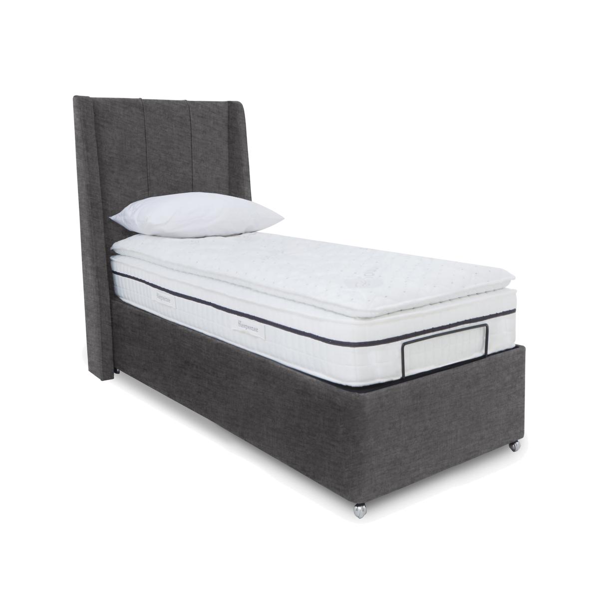Enjoy modern glam bedroom style and perfectly personalised comfort with an adjustable divan bed base from our Akira range. Electric-powered for the smoothest of movements and with multi-setting remote control operation, these divan bases represent the height of adjustable bed technology. And because each comes complete with a beautifully upholstered and decidedly sumptuous headboard, they also score top marks for contemporary style. Bed bases are available in a choice of sizes and offer optional built-in storage and massage functionality. The range also includes dual bases. Designed and handcrafted exclusively for Furniture Village, the Akira range is part of our E-Motion adjustable bed collection. This striking adjustable ottoman divan base comes complete with our statement Akira winged headboard as well as perfect adjustability for superb comfort. Why you'll love it Find perfect comfort for better sleep with this adjustable ottoman divan base. This divan base comes with our modern glam Akira winged headboard. And you’ll love the roomy hidden storage compartment. A simple wireless handset makes this bed so easy to adjust. Use the handy memory function to quickly return to your favourite comfort position. There’s even a weightless-feel pre-set position for TV watching. This divan base promotes restorative sleep by minimising discomfort that might wake you up. Adjustable beds can also reduce back ache, improve blood circulation and reduce snoring. It’s ideal if you need a little help getting in and out of bed. An ethical choice – this ottoman divan base is made with FSC-sourced wood. In a wide selection of fashionable upholstery fabric options. Designed and handcrafted just for Furniture Village. Made in the UK. Also available with 2-person adjustability and massage function. This adjustable ottoman divan base is part of our E-Motion range. What you need to know Mattress sold separately. To ensure bed base and mattress compatibility, consider a mattress from the E-Motion range. Please check the suitability of any mattress you are considering for this adjustable base. Available in single and king sizes. This ottoman divan base opens at the end. Maximum mattress weight is 40 kg for the single ottoman base and 80 kg for the king ottoman base. Please keep hands clear of the mechanism when opening and closing the ottoman. Do not sit on this adjustable bed with the foot end in a raised position. Clean regularly using a soft brush or vacuum with the curtain attachment. Deal with any spills promptly. Professional cleaning advised for oil- and grease-based stains. Some fabrics can show wear on areas of more use or in direct sunlight. Shop our E-Motion range for a huge choice of bed frames, divan bases, massage beds, mattresses and more.