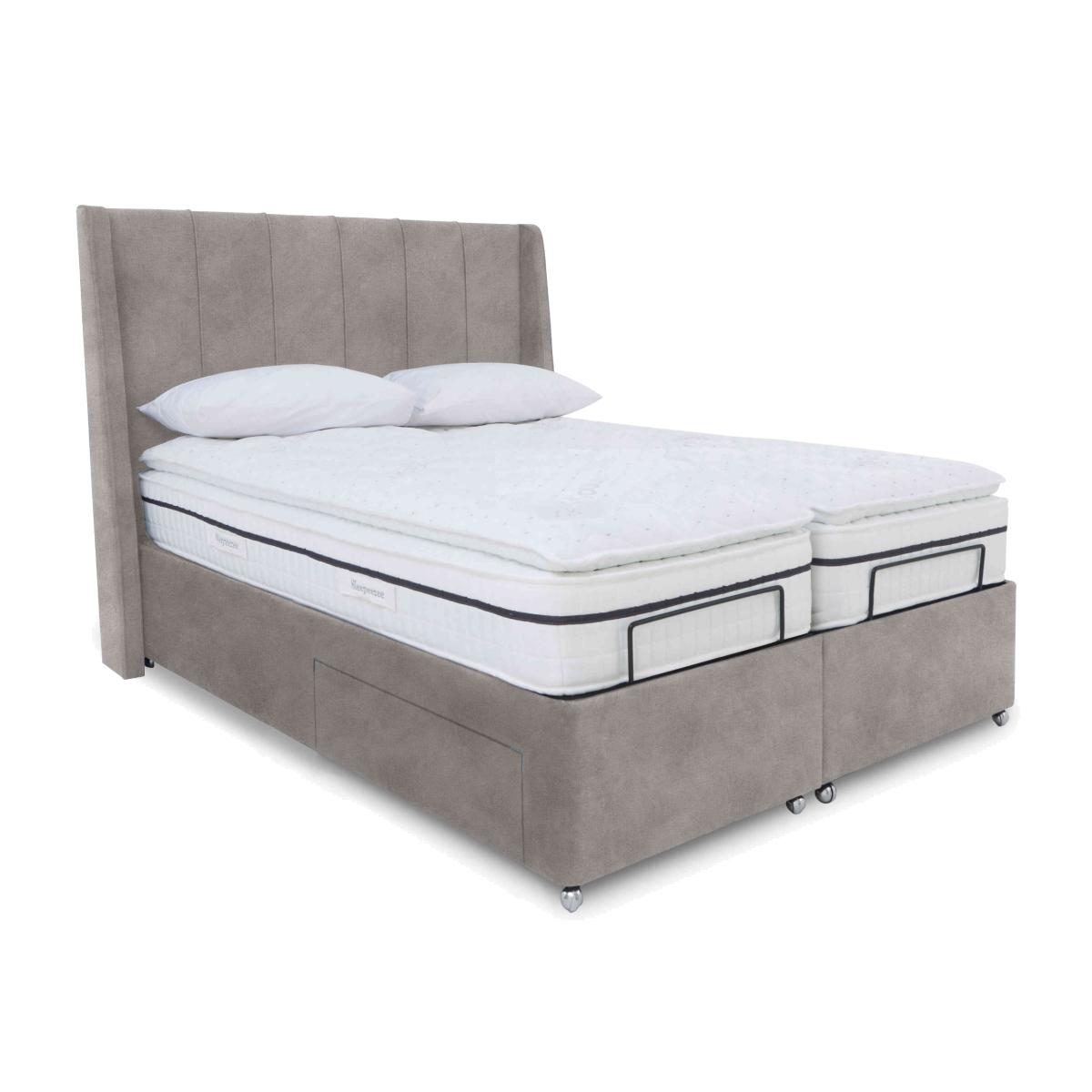 Enjoy modern glam bedroom style and perfectly personalised comfort with an adjustable divan bed base from our Akira range. Electric-powered for the smoothest of movements and with multi-setting remote control operation, these divan bases represent the height of adjustable bed technology. And because each comes complete with a beautifully upholstered and decidedly sumptuous headboard, they also score top marks for contemporary style. Bed bases are available in a choice of sizes and offer optional built-in storage and massage functionality. The range also includes dual bases. Designed and handcrafted exclusively for Furniture Village, the Akira range is part of our E-Motion adjustable bed collection. You’ll love the controllability of this stylish adjustable divan base with winged headboard. There are two separate bases so each of you gets to perfectly adjust their own half. Why you'll love it Find perfect comfort for better sleep with this dual-adjustable divan base. This divan base comes with our modern glam Akira winged headboard. Dual base is electric powered for smooth and efficient movement. With 2 separate bed bases, you and your partner have individual control. A simple wireless handset makes this bed so easy to adjust. Use the handy memory function to quickly return to your favourite comfort position. There’s even a weightless-feel pre-set position for TV watching. This divan base promotes restorative sleep by minimising discomfort that might wake you up. Adjustable beds can also reduce back ache, improve blood circulation and reduce snoring. It’s ideal if you need a little help getting in and out of bed. An ethical choice – this divan base is made with FSC-sourced wood. With optional storage drawers in a range of configurations. In a wide selection of fashionable upholstery fabric options. Designed and handcrafted just for Furniture Village. Made in the UK. Also available with ultra-relaxing massage feature. This dual-adjustable divan base is part of our E-Motion range. What you need to know Mattress sold separately. To ensure bed base and mattress compatibility, consider a mattress from the E-Motion range. Please check the suitability of any mattress you are considering for this adjustable base. Available in king and super king sizes. Do not sit on this adjustable bed with the foot end in a raised position. Clean regularly using a soft brush or vacuum with the curtain attachment. Deal with any spills promptly. Professional cleaning advised for oil- and grease-based stains. Some fabrics can show wear on areas of more use or in direct sunlight. Shop our E-Motion range for a huge choice of bed frames, divan bases, massage beds, mattresses and more.
