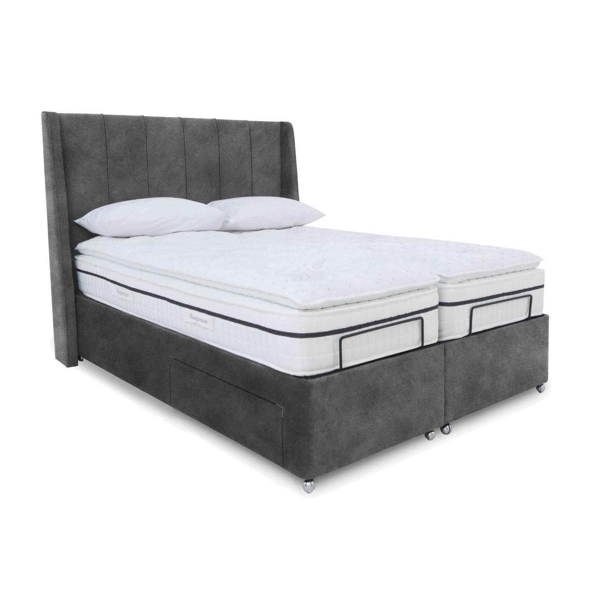Enjoy modern glam bedroom style and perfectly personalised comfort with an adjustable divan bed base from our Akira range. Electric-powered for the smoothest of movements and with multi-setting remote control operation, these divan bases represent the height of adjustable bed technology. And because each comes complete with a beautifully upholstered and decidedly sumptuous headboard, they also score top marks for contemporary style. Bed bases are available in a choice of sizes and offer optional built-in storage and massage functionality. The range also includes dual bases. Designed and handcrafted exclusively for Furniture Village, the Akira range is part of our E-Motion adjustable bed collection. With two adjustable platforms, you and your partner can each perfectly control your own comfort. This adjustable divan base also has massage functionality and comes with stylish winged headboard. Why you'll love it Find perfect comfort for better sleep with this dual-adjustable divan base with massage function. This divan base comes with our modern glam Akira winged headboard. Multi-setting massage function provides soothing relief for aching joints. Dual base is electric powered for smooth and efficient movement. With 2 separate bed bases, you and your partner have individual control. A simple wireless handset makes this bed so easy to adjust. Use the handy memory function to quickly return to your favourite comfort position. There’s even a weightless-feel pre-set position for TV watching. This divan base promotes restorative sleep by minimising discomfort that might wake you up. Adjustable beds can also reduce back ache, improve blood circulation and reduce snoring. It’s ideal if you need a little help getting in and out of bed. An ethical choice – this divan base is made with FSC-sourced wood. With optional storage drawers in a range of configurations. In a wide selection of fashionable upholstery fabric options. Designed and handcrafted just for Furniture Village. Made in the UK. This dual-adjustable massage divan base is part of our E-Motion range. What you need to know Mattress sold separately. To ensure bed base and mattress compatibility, consider a mattress from the E-Motion range. Please check the suitability of any mattress you are considering for this adjustable base. In king and super king sizes with dual control. Also available in single size. Do not sit on this adjustable bed with the foot end in a raised position. Clean regularly using a soft brush or vacuum with the curtain attachment. Deal with any spills promptly. Professional cleaning advised for oil- and grease-based stains. Some fabrics can show wear on areas of more use or in direct sunlight. Shop our E-Motion range for a huge choice of bed frames, divan bases, massage beds, mattresses and more.