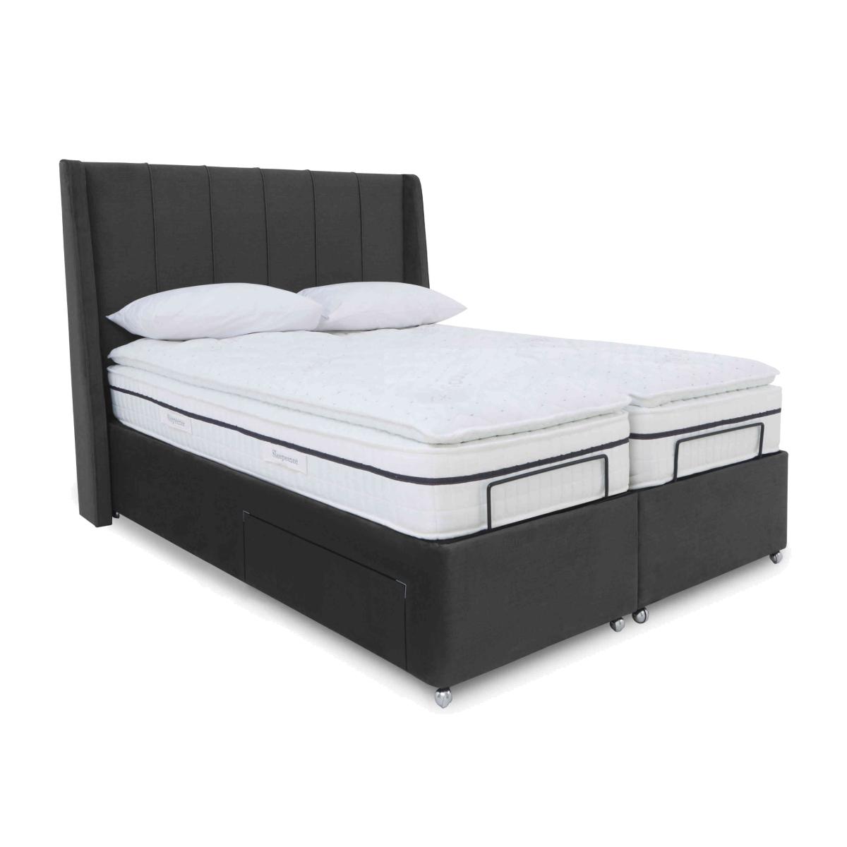 Enjoy modern glam bedroom style and perfectly personalised comfort with an adjustable divan bed base from our Akira range. Electric-powered for the smoothest of movements and with multi-setting remote control operation, these divan bases represent the height of adjustable bed technology. And because each comes complete with a beautifully upholstered and decidedly sumptuous headboard, they also score top marks for contemporary style. Bed bases are available in a choice of sizes and offer optional built-in storage and massage functionality. The range also includes dual bases. Designed and handcrafted exclusively for Furniture Village, the Akira range is part of our E-Motion adjustable bed collection. With two adjustable platforms, you and your partner can each perfectly control your own comfort. This adjustable divan base also has massage functionality and comes with stylish winged headboard. Why you'll love it Find perfect comfort for better sleep with this dual-adjustable divan base with massage function. This divan base comes with our modern glam Akira winged headboard. Multi-setting massage function provides soothing relief for aching joints. Dual base is electric powered for smooth and efficient movement. With 2 separate bed bases, you and your partner have individual control. A simple wireless handset makes this bed so easy to adjust. Use the handy memory function to quickly return to your favourite comfort position. There’s even a weightless-feel pre-set position for TV watching. This divan base promotes restorative sleep by minimising discomfort that might wake you up. Adjustable beds can also reduce back ache, improve blood circulation and reduce snoring. It’s ideal if you need a little help getting in and out of bed. An ethical choice – this divan base is made with FSC-sourced wood. With optional storage drawers in a range of configurations. In a wide selection of fashionable upholstery fabric options. Designed and handcrafted just for Furniture Village. Made in the UK. This dual-adjustable massage divan base is part of our E-Motion range. What you need to know Mattress sold separately. To ensure bed base and mattress compatibility, consider a mattress from the E-Motion range. Please check the suitability of any mattress you are considering for this adjustable base. In king and super king sizes with dual control. Also available in single size. Do not sit on this adjustable bed with the foot end in a raised position. Clean regularly using a soft brush or vacuum with the curtain attachment. Deal with any spills promptly. Professional cleaning advised for oil- and grease-based stains. Some fabrics can show wear on areas of more use or in direct sunlight. Shop our E-Motion range for a huge choice of bed frames, divan bases, massage beds, mattresses and more.