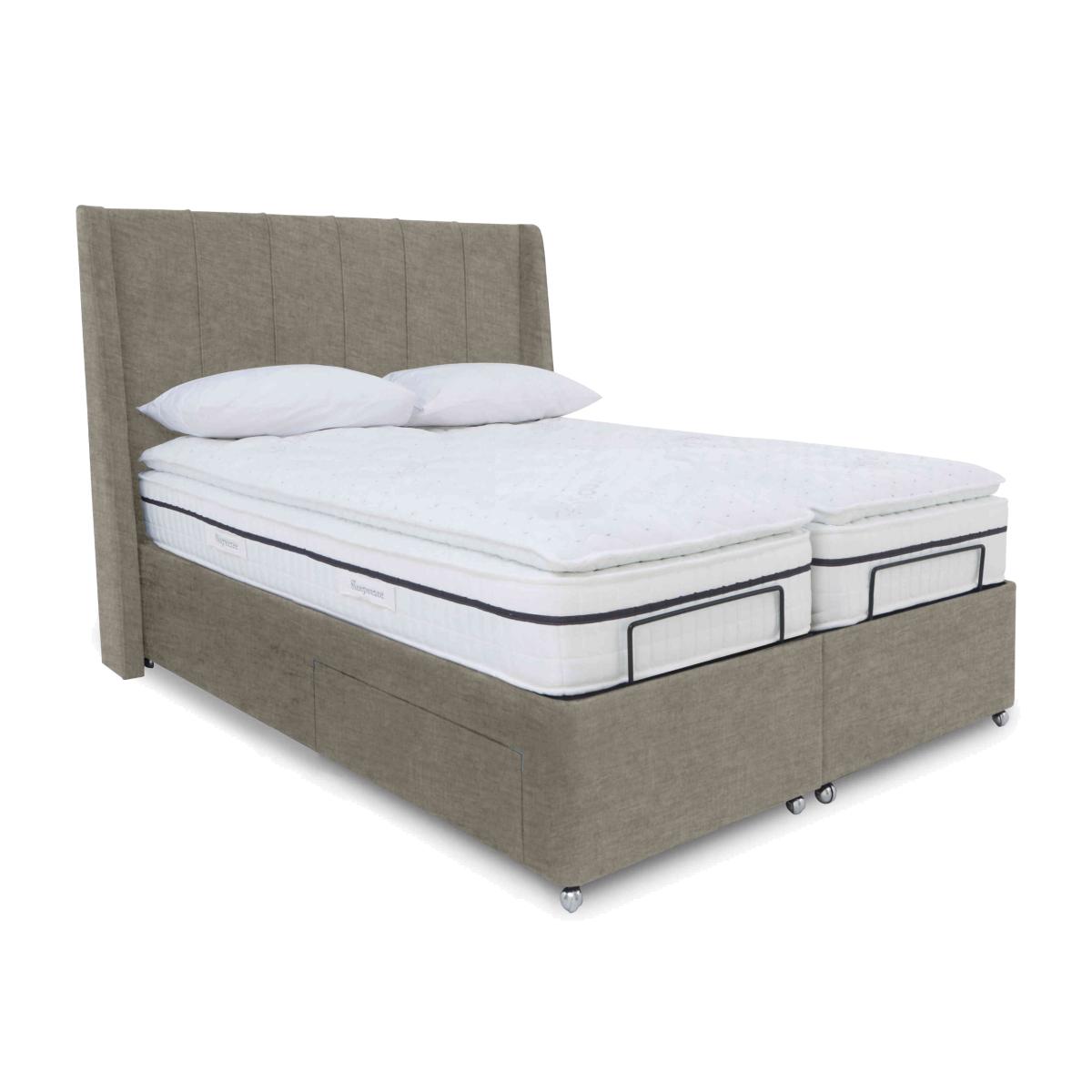 Enjoy modern glam bedroom style and perfectly personalised comfort with an adjustable divan bed base from our Akira range. Electric-powered for the smoothest of movements and with multi-setting remote control operation, these divan bases represent the height of adjustable bed technology. And because each comes complete with a beautifully upholstered and decidedly sumptuous headboard, they also score top marks for contemporary style. Bed bases are available in a choice of sizes and offer optional built-in storage and massage functionality. The range also includes dual bases. Designed and handcrafted exclusively for Furniture Village, the Akira range is part of our E-Motion adjustable bed collection. With two adjustable platforms, you and your partner can each perfectly control your own comfort. This adjustable divan base also has massage functionality and comes with stylish winged headboard. Why you'll love it Find perfect comfort for better sleep with this dual-adjustable divan base with massage function. This divan base comes with our modern glam Akira winged headboard. Multi-setting massage function provides soothing relief for aching joints. Dual base is electric powered for smooth and efficient movement. With 2 separate bed bases, you and your partner have individual control. A simple wireless handset makes this bed so easy to adjust. Use the handy memory function to quickly return to your favourite comfort position. There’s even a weightless-feel pre-set position for TV watching. This divan base promotes restorative sleep by minimising discomfort that might wake you up. Adjustable beds can also reduce back ache, improve blood circulation and reduce snoring. It’s ideal if you need a little help getting in and out of bed. An ethical choice – this divan base is made with FSC-sourced wood. With optional storage drawers in a range of configurations. In a wide selection of fashionable upholstery fabric options. Designed and handcrafted just for Furniture Village. Made in the UK. This dual-adjustable massage divan base is part of our E-Motion range. What you need to know Mattress sold separately. To ensure bed base and mattress compatibility, consider a mattress from the E-Motion range. Please check the suitability of any mattress you are considering for this adjustable base. In king and super king sizes with dual control. Also available in single size. Do not sit on this adjustable bed with the foot end in a raised position. Clean regularly using a soft brush or vacuum with the curtain attachment. Deal with any spills promptly. Professional cleaning advised for oil- and grease-based stains. Some fabrics can show wear on areas of more use or in direct sunlight. Shop our E-Motion range for a huge choice of bed frames, divan bases, massage beds, mattresses and more.