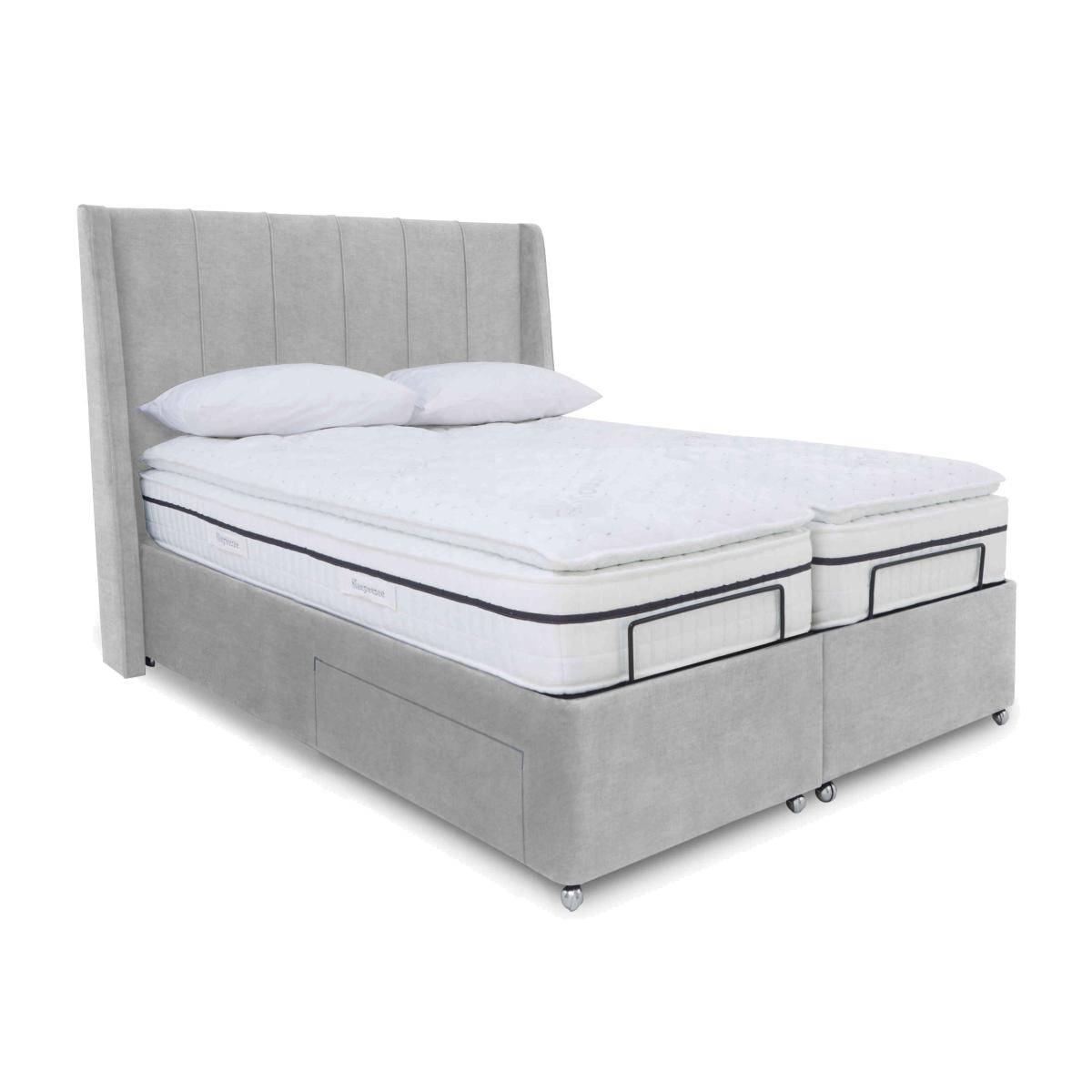 Enjoy modern glam bedroom style and perfectly personalised comfort with an adjustable divan bed base from our Akira range. Electric-powered for the smoothest of movements and with multi-setting remote control operation, these divan bases represent the height of adjustable bed technology. And because each comes complete with a beautifully upholstered and decidedly sumptuous headboard, they also score top marks for contemporary style. Bed bases are available in a choice of sizes and offer optional built-in storage and massage functionality. The range also includes dual bases. Designed and handcrafted exclusively for Furniture Village, the Akira range is part of our E-Motion adjustable bed collection. You’ll love the controllability of this stylish adjustable divan base with winged headboard. There are two separate bases so each of you gets to perfectly adjust their own half. Why you'll love it Find perfect comfort for better sleep with this dual-adjustable divan base. This divan base comes with our modern glam Akira winged headboard. Dual base is electric powered for smooth and efficient movement. With 2 separate bed bases, you and your partner have individual control. A simple wireless handset makes this bed so easy to adjust. Use the handy memory function to quickly return to your favourite comfort position. There’s even a weightless-feel pre-set position for TV watching. This divan base promotes restorative sleep by minimising discomfort that might wake you up. Adjustable beds can also reduce back ache, improve blood circulation and reduce snoring. It’s ideal if you need a little help getting in and out of bed. An ethical choice – this divan base is made with FSC-sourced wood. With optional storage drawers in a range of configurations. In a wide selection of fashionable upholstery fabric options. Designed and handcrafted just for Furniture Village. Made in the UK. Also available with ultra-relaxing massage feature. This dual-adjustable divan base is part of our E-Motion range. What you need to know Mattress sold separately. To ensure bed base and mattress compatibility, consider a mattress from the E-Motion range. Please check the suitability of any mattress you are considering for this adjustable base. Available in king and super king sizes. Do not sit on this adjustable bed with the foot end in a raised position. Clean regularly using a soft brush or vacuum with the curtain attachment. Deal with any spills promptly. Professional cleaning advised for oil- and grease-based stains. Some fabrics can show wear on areas of more use or in direct sunlight. Shop our E-Motion range for a huge choice of bed frames, divan bases, massage beds, mattresses and more.