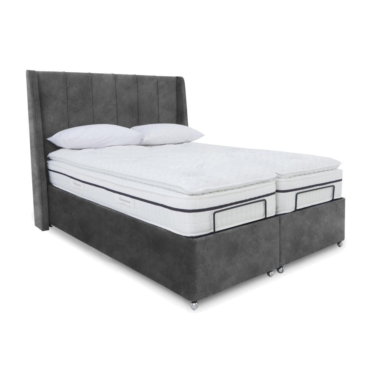 Enjoy modern glam bedroom style and perfectly personalised comfort with an adjustable divan bed base from our Akira range. Electric-powered for the smoothest of movements and with multi-setting remote control operation, these divan bases represent the height of adjustable bed technology. And because each comes complete with a beautifully upholstered and decidedly sumptuous headboard, they also score top marks for contemporary style. Bed bases are available in a choice of sizes and offer optional built-in storage and massage functionality. The range also includes dual bases. Designed and handcrafted exclusively for Furniture Village, the Akira range is part of our E-Motion adjustable bed collection. One size doesn’t fit all. That’s why this adjustable ottoman divan base has two separate and individually adjustable bases. It also has massage functionality and a stylish winged headboard. Why you'll love it Find perfect comfort for better sleep with this dual-adjustable ottoman divan base. This divan base comes with our modern glam Akira winged headboard. And you’ll love the roomy hidden storage compartment. Dual base is electric powered for smooth and efficient movement. With 2 separate bed bases, you and your partner have individual control. A simple wireless handset makes this bed so easy to adjust. Use the handy memory function to quickly return to your favourite comfort position. There’s even a weightless-feel pre-set position for TV watching. This divan base promotes restorative sleep by minimising discomfort that might wake you up. Adjustable beds can also reduce back ache, improve blood circulation and reduce snoring. It’s ideal if you need a little help getting in and out of bed. An ethical choice – this ottoman divan base is made with FSC-sourced wood. In a wide selection of fashionable upholstery fabric options. Designed and handcrafted just for Furniture Village. Made in the UK. Also available with ultra-relaxing massage feature. This dual-adjustable ottoman divan base is part of our E-Motion range. What you need to know Mattress sold separately. To ensure bed base and mattress compatibility, consider a mattress from the E-Motion range. Please check the suitability of any mattress you are considering for this adjustable base. Available in king and super king sizes. This ottoman divan base opens at the end. Maximum mattress weight is 80 kg. Please keep hands clear of the mechanism when opening and closing the ottoman. Do not sit on this adjustable bed with the foot end in a raised position. Clean regularly using a soft brush or vacuum with the curtain attachment. Deal with any spills promptly. Professional cleaning advised for oil- and grease-based stains. Some fabrics can show wear on areas of more use or in direct sunlight. Shop our E-Motion range for a huge choice of bed frames, divan bases, massage beds, mattresses and more.
