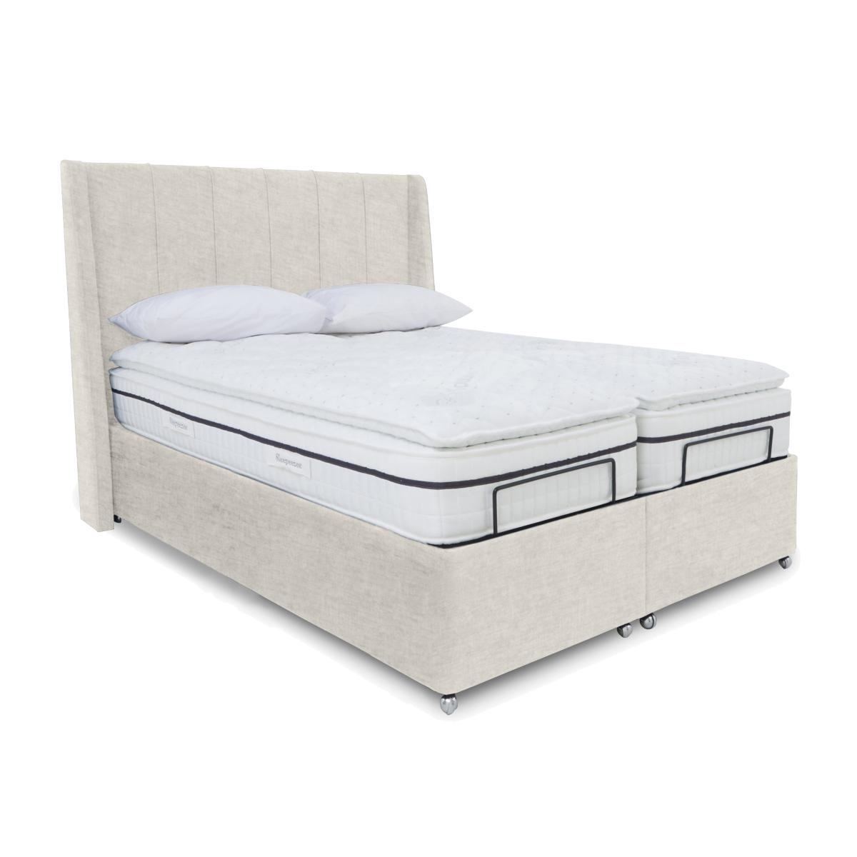 Enjoy modern glam bedroom style and perfectly personalised comfort with an adjustable divan bed base from our Akira range. Electric-powered for the smoothest of movements and with multi-setting remote control operation, these divan bases represent the height of adjustable bed technology. And because each comes complete with a beautifully upholstered and decidedly sumptuous headboard, they also score top marks for contemporary style. Bed bases are available in a choice of sizes and offer optional built-in storage and massage functionality. The range also includes dual bases. Designed and handcrafted exclusively for Furniture Village, the Akira range is part of our E-Motion adjustable bed collection. One size doesn’t fit all. That’s why this adjustable ottoman divan base has two separate and individually adjustable bases. It also has massage functionality and a stylish winged headboard. Why you'll love it Find perfect comfort for better sleep with this dual-adjustable ottoman divan base. This divan base comes with our modern glam Akira winged headboard. And you’ll love the roomy hidden storage compartment. Dual base is electric powered for smooth and efficient movement. With 2 separate bed bases, you and your partner have individual control. A simple wireless handset makes this bed so easy to adjust. Use the handy memory function to quickly return to your favourite comfort position. There’s even a weightless-feel pre-set position for TV watching. This divan base promotes restorative sleep by minimising discomfort that might wake you up. Adjustable beds can also reduce back ache, improve blood circulation and reduce snoring. It’s ideal if you need a little help getting in and out of bed. An ethical choice – this ottoman divan base is made with FSC-sourced wood. In a wide selection of fashionable upholstery fabric options. Designed and handcrafted just for Furniture Village. Made in the UK. Also available with ultra-relaxing massage feature. This dual-adjustable ottoman divan base is part of our E-Motion range. What you need to know Mattress sold separately. To ensure bed base and mattress compatibility, consider a mattress from the E-Motion range. Please check the suitability of any mattress you are considering for this adjustable base. Available in king and super king sizes. This ottoman divan base opens at the end. Maximum mattress weight is 80 kg. Please keep hands clear of the mechanism when opening and closing the ottoman. Do not sit on this adjustable bed with the foot end in a raised position. Clean regularly using a soft brush or vacuum with the curtain attachment. Deal with any spills promptly. Professional cleaning advised for oil- and grease-based stains. Some fabrics can show wear on areas of more use or in direct sunlight. Shop our E-Motion range for a huge choice of bed frames, divan bases, massage beds, mattresses and more.