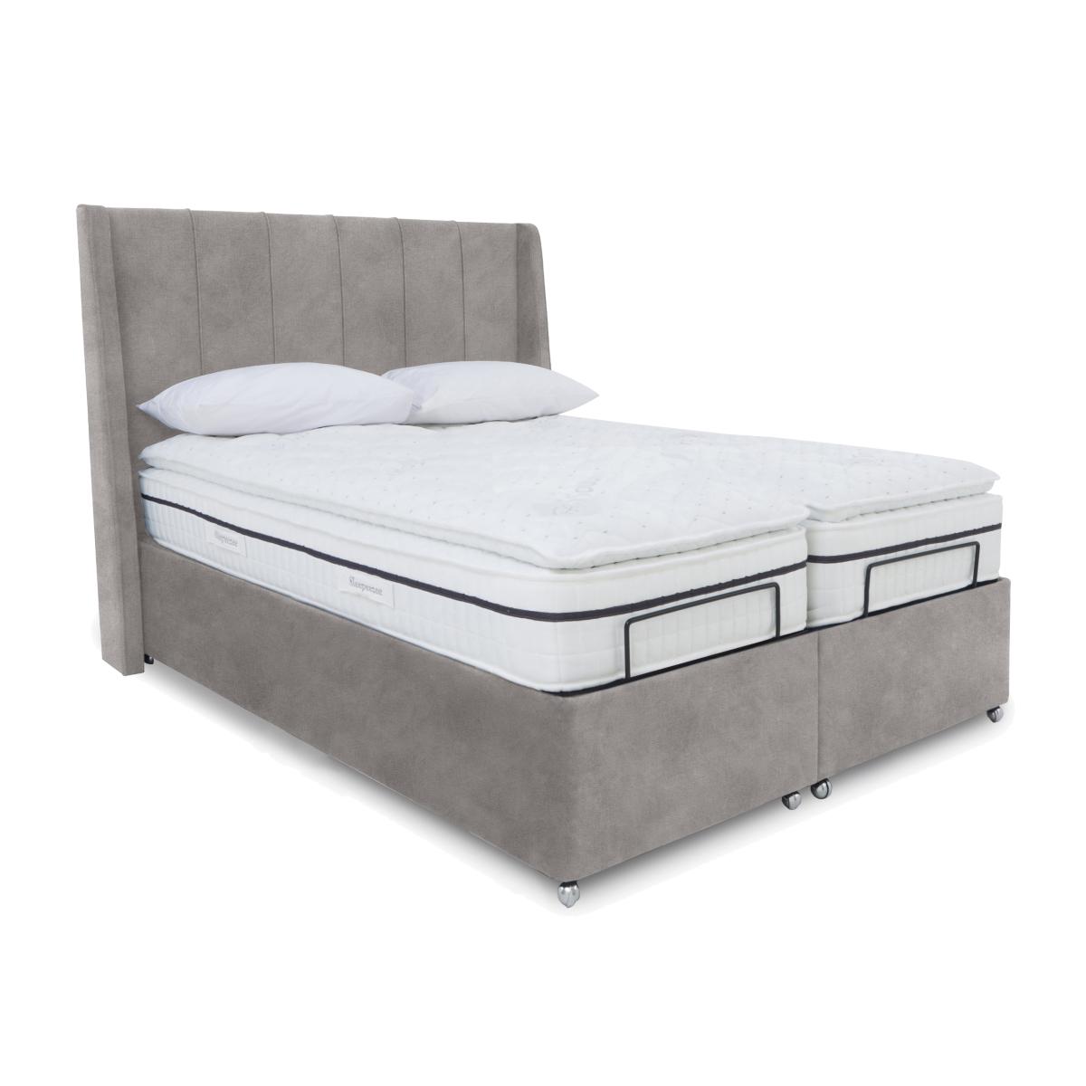 Enjoy modern glam bedroom style and perfectly personalised comfort with an adjustable divan bed base from our Akira range. Electric-powered for the smoothest of movements and with multi-setting remote control operation, these divan bases represent the height of adjustable bed technology. And because each comes complete with a beautifully upholstered and decidedly sumptuous headboard, they also score top marks for contemporary style. Bed bases are available in a choice of sizes and offer optional built-in storage and massage functionality. The range also includes dual bases. Designed and handcrafted exclusively for Furniture Village, the Akira range is part of our E-Motion adjustable bed collection. This adjustable divan base really does it all. Alongside the ability to quickly find your perfect comfort position, you’ll enjoy massage functionality, large ottoman storage and a beautiful winged headboard. Why you'll love it Find perfect comfort for better sleep with this dual-adjustable massage ottoman divan base with massage function. This divan base comes with our modern glam Akira winged headboard. And you’ll love the roomy hidden storage compartment. Multi-setting massage function provides soothing relief for aching joints. Dual base is electric powered for smooth and efficient movement. With 2 separate bed bases, you and your partner have individual control. A simple wireless handset makes this bed so easy to adjust. Use the handy memory function to quickly return to your favourite comfort position. There’s even a weightless-feel pre-set position for TV watching. This divan base promotes restorative sleep by minimising discomfort that might wake you up. Adjustable beds can also reduce back ache, improve blood circulation and reduce snoring. It’s ideal if you need a little help getting in and out of bed. An ethical choice – this ottoman divan base is made with FSC-sourced wood. In a wide selection of fashionable upholstery fabric options. Designed and handcrafted just for Furniture Village. Made in the UK. This dual-adjustable massage ottoman divan base is part of our E-Motion range. What you need to know Mattress sold separately. To ensure bed base and mattress compatibility, consider a mattress from the E-Motion range. Please check the suitability of any mattress you are considering for this adjustable base. In king and super king sizes with dual control. Also available in single size. This ottoman divan base opens at the end. Maximum mattress weight is 40 kg for the single ottoman base and 80 kg for the king and super king ottoman bases. Please keep hands clear of the mechanism when opening and closing the ottoman. Do not sit on this adjustable bed with the foot end in a raised position. Clean regularly using a soft brush or vacuum with the curtain attachment. Deal with any spills promptly. Professional cleaning advised for oil- and grease-based stains. Some fabrics can show wear on areas of more use or in direct sunlight. Shop our E-Motion range for a huge choice of bed frames, divan bases, massage beds, mattresses and more.