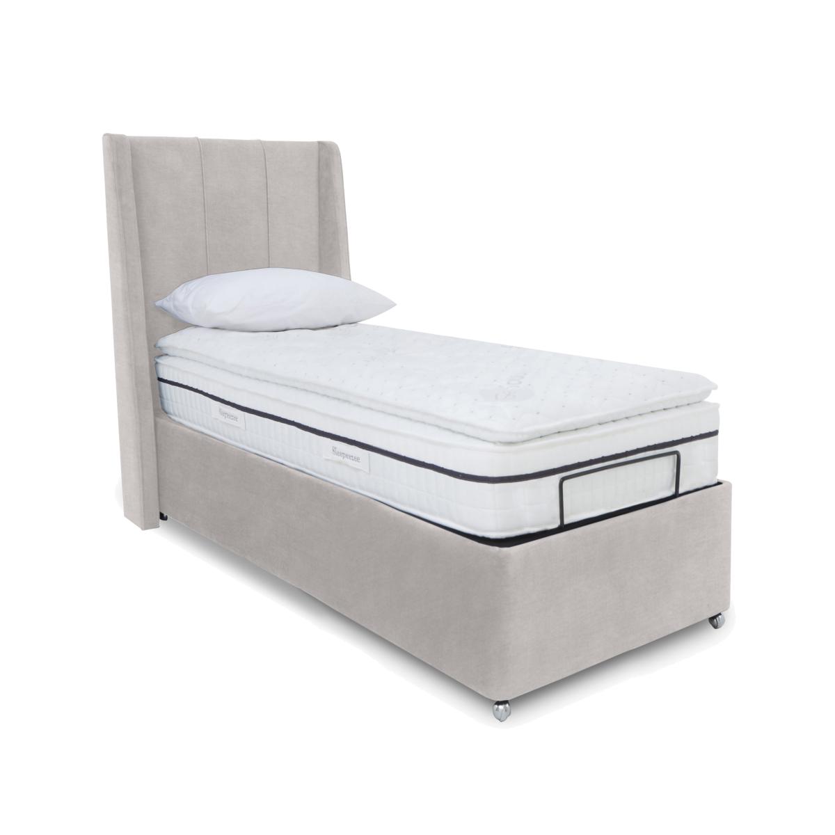 Enjoy modern glam bedroom style and perfectly personalised comfort with an adjustable divan bed base from our Akira range. Electric-powered for the smoothest of movements and with multi-setting remote control operation, these divan bases represent the height of adjustable bed technology. And because each comes complete with a beautifully upholstered and decidedly sumptuous headboard, they also score top marks for contemporary style. Bed bases are available in a choice of sizes and offer optional built-in storage and massage functionality. The range also includes dual bases. Designed and handcrafted exclusively for Furniture Village, the Akira range is part of our E-Motion adjustable bed collection. This adjustable divan base really does it all. Alongside the ability to quickly find your perfect comfort position, you’ll enjoy massage functionality, large ottoman storage and a beautiful winged headboard. Why you'll love it Find perfect comfort for better sleep with this dual-adjustable massage ottoman divan base with massage function. This divan base comes with our modern glam Akira winged headboard. And you’ll love the roomy hidden storage compartment. Multi-setting massage function provides soothing relief for aching joints. Dual base is electric powered for smooth and efficient movement. With 2 separate bed bases, you and your partner have individual control. A simple wireless handset makes this bed so easy to adjust. Use the handy memory function to quickly return to your favourite comfort position. There’s even a weightless-feel pre-set position for TV watching. This divan base promotes restorative sleep by minimising discomfort that might wake you up. Adjustable beds can also reduce back ache, improve blood circulation and reduce snoring. It’s ideal if you need a little help getting in and out of bed. An ethical choice – this ottoman divan base is made with FSC-sourced wood. In a wide selection of fashionable upholstery fabric options. Designed and handcrafted just for Furniture Village. Made in the UK. This dual-adjustable massage ottoman divan base is part of our E-Motion range. What you need to know Mattress sold separately. To ensure bed base and mattress compatibility, consider a mattress from the E-Motion range. Please check the suitability of any mattress you are considering for this adjustable base. In king and super king sizes with dual control. Also available in single size. This ottoman divan base opens at the end. Maximum mattress weight is 40 kg for the single ottoman base and 80 kg for the king and super king ottoman bases. Please keep hands clear of the mechanism when opening and closing the ottoman. Do not sit on this adjustable bed with the foot end in a raised position. Clean regularly using a soft brush or vacuum with the curtain attachment. Deal with any spills promptly. Professional cleaning advised for oil- and grease-based stains. Some fabrics can show wear on areas of more use or in direct sunlight. Shop our E-Motion range for a huge choice of bed frames, divan bases, massage beds, mattresses and more.
