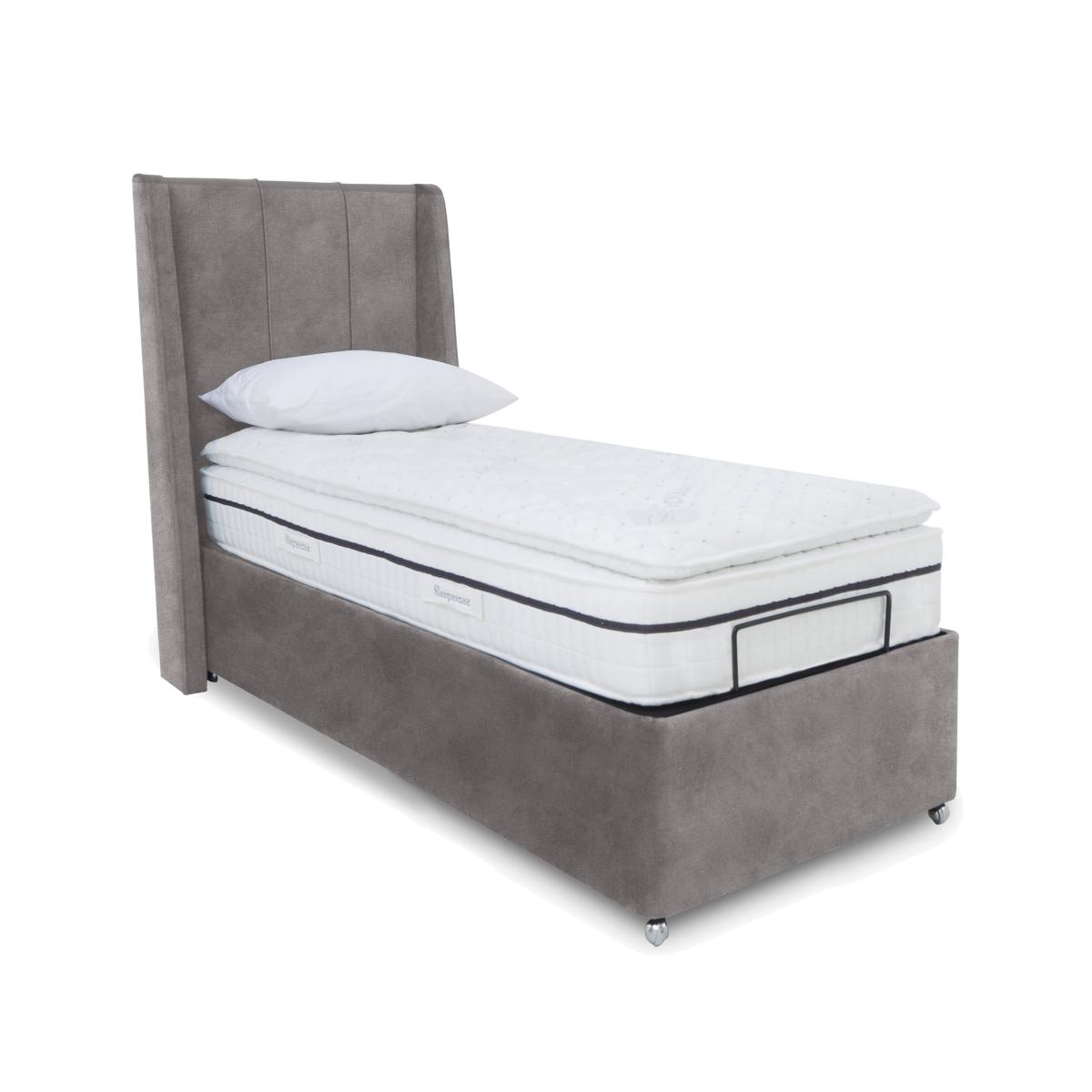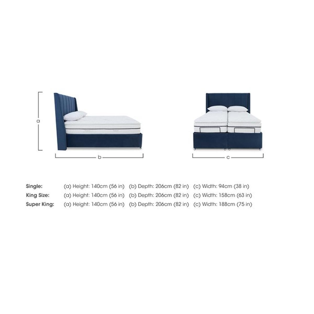 Enjoy modern glam bedroom style and perfectly personalised comfort with an adjustable divan bed base from our Akira range. Electric-powered for the smoothest of movements and with multi-setting remote control operation, these divan bases represent the height of adjustable bed technology. And because each comes complete with a beautifully upholstered and decidedly sumptuous headboard, they also score top marks for contemporary style. Bed bases are available in a choice of sizes and offer optional built-in storage and massage functionality. The range also includes dual bases. Designed and handcrafted exclusively for Furniture Village, the Akira range is part of our E-Motion adjustable bed collection. This adjustable divan base really does it all. Alongside the ability to quickly find your perfect comfort position, you’ll enjoy massage functionality, large ottoman storage and a beautiful winged headboard. Why you'll love it Find perfect comfort for better sleep with this dual-adjustable massage ottoman divan base with massage function. This divan base comes with our modern glam Akira winged headboard. And you’ll love the roomy hidden storage compartment. Multi-setting massage function provides soothing relief for aching joints. Dual base is electric powered for smooth and efficient movement. With 2 separate bed bases, you and your partner have individual control. A simple wireless handset makes this bed so easy to adjust. Use the handy memory function to quickly return to your favourite comfort position. There’s even a weightless-feel pre-set position for TV watching. This divan base promotes restorative sleep by minimising discomfort that might wake you up. Adjustable beds can also reduce back ache, improve blood circulation and reduce snoring. It’s ideal if you need a little help getting in and out of bed. An ethical choice – this ottoman divan base is made with FSC-sourced wood. In a wide selection of fashionable upholstery fabric options. Designed and handcrafted just for Furniture Village. Made in the UK. This dual-adjustable massage ottoman divan base is part of our E-Motion range. What you need to know Mattress sold separately. To ensure bed base and mattress compatibility, consider a mattress from the E-Motion range. Please check the suitability of any mattress you are considering for this adjustable base. In king and super king sizes with dual control. Also available in single size. This ottoman divan base opens at the end. Maximum mattress weight is 40 kg for the single ottoman base and 80 kg for the king and super king ottoman bases. Please keep hands clear of the mechanism when opening and closing the ottoman. Do not sit on this adjustable bed with the foot end in a raised position. Clean regularly using a soft brush or vacuum with the curtain attachment. Deal with any spills promptly. Professional cleaning advised for oil- and grease-based stains. Some fabrics can show wear on areas of more use or in direct sunlight. Shop our E-Motion range for a huge choice of bed frames, divan bases, massage beds, mattresses and more.