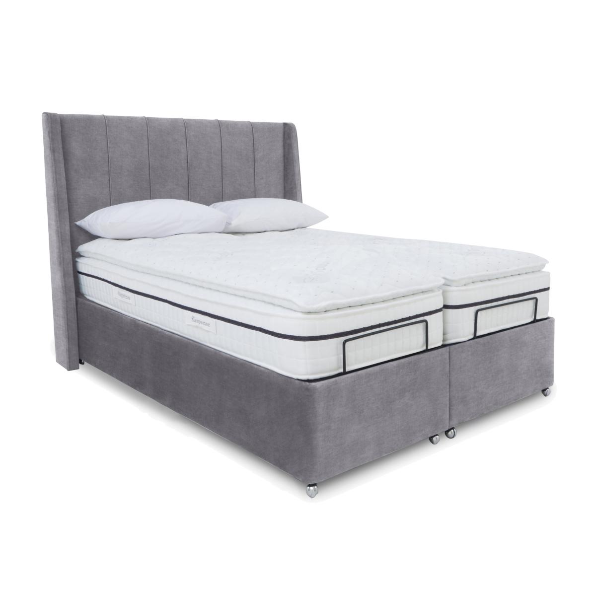 Enjoy modern glam bedroom style and perfectly personalised comfort with an adjustable divan bed base from our Akira range. Electric-powered for the smoothest of movements and with multi-setting remote control operation, these divan bases represent the height of adjustable bed technology. And because each comes complete with a beautifully upholstered and decidedly sumptuous headboard, they also score top marks for contemporary style. Bed bases are available in a choice of sizes and offer optional built-in storage and massage functionality. The range also includes dual bases. Designed and handcrafted exclusively for Furniture Village, the Akira range is part of our E-Motion adjustable bed collection. This adjustable divan base really does it all. Alongside the ability to quickly find your perfect comfort position, you’ll enjoy massage functionality, large ottoman storage and a beautiful winged headboard. Why you'll love it Find perfect comfort for better sleep with this dual-adjustable massage ottoman divan base with massage function. This divan base comes with our modern glam Akira winged headboard. And you’ll love the roomy hidden storage compartment. Multi-setting massage function provides soothing relief for aching joints. Dual base is electric powered for smooth and efficient movement. With 2 separate bed bases, you and your partner have individual control. A simple wireless handset makes this bed so easy to adjust. Use the handy memory function to quickly return to your favourite comfort position. There’s even a weightless-feel pre-set position for TV watching. This divan base promotes restorative sleep by minimising discomfort that might wake you up. Adjustable beds can also reduce back ache, improve blood circulation and reduce snoring. It’s ideal if you need a little help getting in and out of bed. An ethical choice – this ottoman divan base is made with FSC-sourced wood. In a wide selection of fashionable upholstery fabric options. Designed and handcrafted just for Furniture Village. Made in the UK. This dual-adjustable massage ottoman divan base is part of our E-Motion range. What you need to know Mattress sold separately. To ensure bed base and mattress compatibility, consider a mattress from the E-Motion range. Please check the suitability of any mattress you are considering for this adjustable base. In king and super king sizes with dual control. Also available in single size. This ottoman divan base opens at the end. Maximum mattress weight is 40 kg for the single ottoman base and 80 kg for the king and super king ottoman bases. Please keep hands clear of the mechanism when opening and closing the ottoman. Do not sit on this adjustable bed with the foot end in a raised position. Clean regularly using a soft brush or vacuum with the curtain attachment. Deal with any spills promptly. Professional cleaning advised for oil- and grease-based stains. Some fabrics can show wear on areas of more use or in direct sunlight. Shop our E-Motion range for a huge choice of bed frames, divan bases, massage beds, mattresses and more.