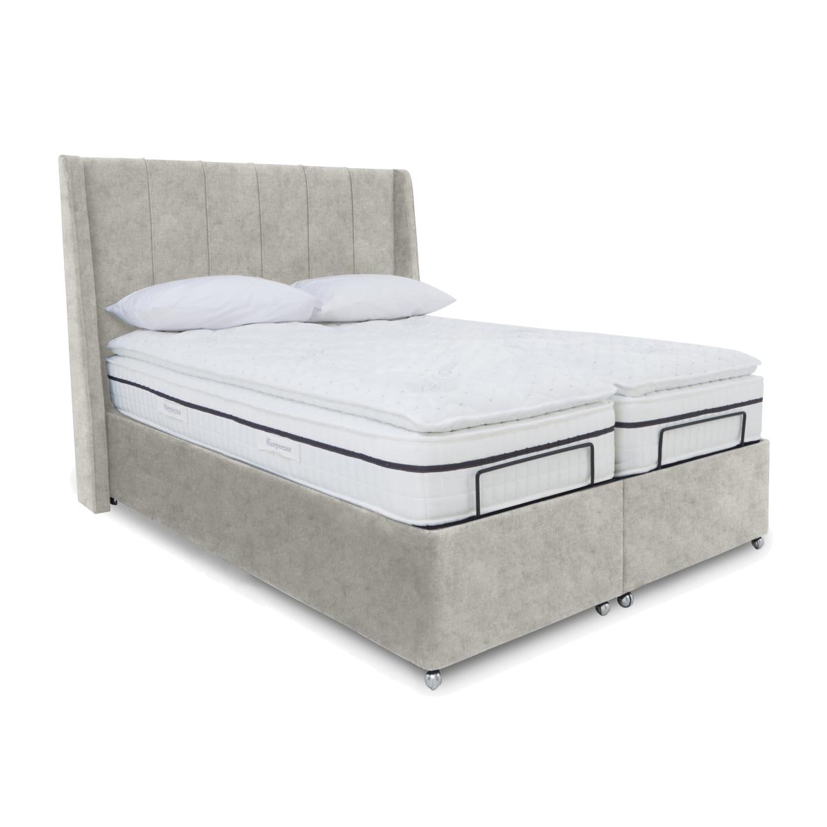 Enjoy modern glam bedroom style and perfectly personalised comfort with an adjustable divan bed base from our Akira range. Electric-powered for the smoothest of movements and with multi-setting remote control operation, these divan bases represent the height of adjustable bed technology. And because each comes complete with a beautifully upholstered and decidedly sumptuous headboard, they also score top marks for contemporary style. Bed bases are available in a choice of sizes and offer optional built-in storage and massage functionality. The range also includes dual bases. Designed and handcrafted exclusively for Furniture Village, the Akira range is part of our E-Motion adjustable bed collection. This adjustable divan base really does it all. Alongside the ability to quickly find your perfect comfort position, you’ll enjoy massage functionality, large ottoman storage and a beautiful winged headboard. Why you'll love it Find perfect comfort for better sleep with this dual-adjustable massage ottoman divan base with massage function. This divan base comes with our modern glam Akira winged headboard. And you’ll love the roomy hidden storage compartment. Multi-setting massage function provides soothing relief for aching joints. Dual base is electric powered for smooth and efficient movement. With 2 separate bed bases, you and your partner have individual control. A simple wireless handset makes this bed so easy to adjust. Use the handy memory function to quickly return to your favourite comfort position. There’s even a weightless-feel pre-set position for TV watching. This divan base promotes restorative sleep by minimising discomfort that might wake you up. Adjustable beds can also reduce back ache, improve blood circulation and reduce snoring. It’s ideal if you need a little help getting in and out of bed. An ethical choice – this ottoman divan base is made with FSC-sourced wood. In a wide selection of fashionable upholstery fabric options. Designed and handcrafted just for Furniture Village. Made in the UK. This dual-adjustable massage ottoman divan base is part of our E-Motion range. What you need to know Mattress sold separately. To ensure bed base and mattress compatibility, consider a mattress from the E-Motion range. Please check the suitability of any mattress you are considering for this adjustable base. In king and super king sizes with dual control. Also available in single size. This ottoman divan base opens at the end. Maximum mattress weight is 40 kg for the single ottoman base and 80 kg for the king and super king ottoman bases. Please keep hands clear of the mechanism when opening and closing the ottoman. Do not sit on this adjustable bed with the foot end in a raised position. Clean regularly using a soft brush or vacuum with the curtain attachment. Deal with any spills promptly. Professional cleaning advised for oil- and grease-based stains. Some fabrics can show wear on areas of more use or in direct sunlight. Shop our E-Motion range for a huge choice of bed frames, divan bases, massage beds, mattresses and more.