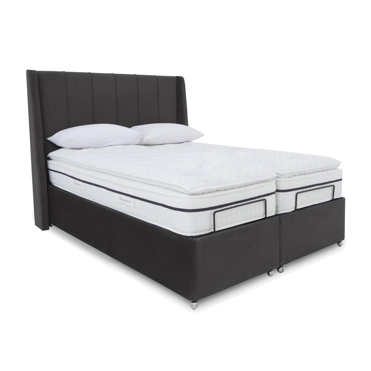 Enjoy modern glam bedroom style and perfectly personalised comfort with an adjustable divan bed base from our Akira range. Electric-powered for the smoothest of movements and with multi-setting remote control operation, these divan bases represent the height of adjustable bed technology. And because each comes complete with a beautifully upholstered and decidedly sumptuous headboard, they also score top marks for contemporary style. Bed bases are available in a choice of sizes and offer optional built-in storage and massage functionality. The range also includes dual bases. Designed and handcrafted exclusively for Furniture Village, the Akira range is part of our E-Motion adjustable bed collection. This adjustable divan base really does it all. Alongside the ability to quickly find your perfect comfort position, you’ll enjoy massage functionality, large ottoman storage and a beautiful winged headboard. Why you'll love it Find perfect comfort for better sleep with this dual-adjustable massage ottoman divan base with massage function. This divan base comes with our modern glam Akira winged headboard. And you’ll love the roomy hidden storage compartment. Multi-setting massage function provides soothing relief for aching joints. Dual base is electric powered for smooth and efficient movement. With 2 separate bed bases, you and your partner have individual control. A simple wireless handset makes this bed so easy to adjust. Use the handy memory function to quickly return to your favourite comfort position. There’s even a weightless-feel pre-set position for TV watching. This divan base promotes restorative sleep by minimising discomfort that might wake you up. Adjustable beds can also reduce back ache, improve blood circulation and reduce snoring. It’s ideal if you need a little help getting in and out of bed. An ethical choice – this ottoman divan base is made with FSC-sourced wood. In a wide selection of fashionable upholstery fabric options. Designed and handcrafted just for Furniture Village. Made in the UK. This dual-adjustable massage ottoman divan base is part of our E-Motion range. What you need to know Mattress sold separately. To ensure bed base and mattress compatibility, consider a mattress from the E-Motion range. Please check the suitability of any mattress you are considering for this adjustable base. In king and super king sizes with dual control. Also available in single size. This ottoman divan base opens at the end. Maximum mattress weight is 40 kg for the single ottoman base and 80 kg for the king and super king ottoman bases. Please keep hands clear of the mechanism when opening and closing the ottoman. Do not sit on this adjustable bed with the foot end in a raised position. Clean regularly using a soft brush or vacuum with the curtain attachment. Deal with any spills promptly. Professional cleaning advised for oil- and grease-based stains. Some fabrics can show wear on areas of more use or in direct sunlight. Shop our E-Motion range for a huge choice of bed frames, divan bases, massage beds, mattresses and more.